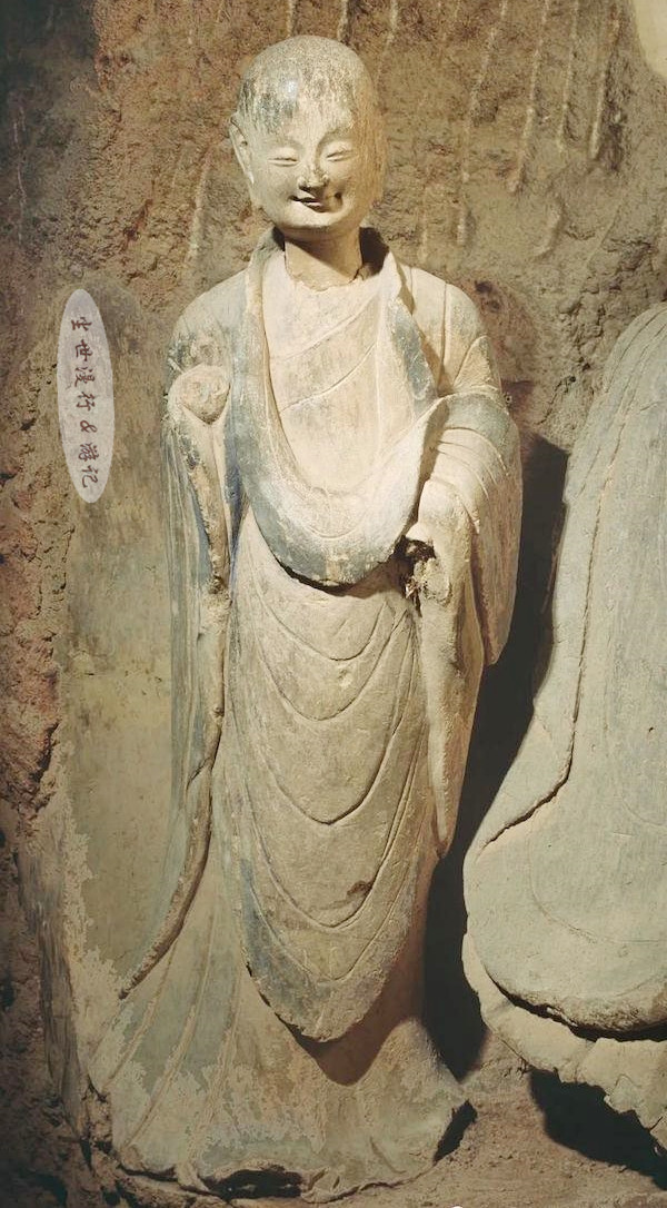 在微笑造像中,最吸引人的是西崖第133窟的传神之作小沙弥,据说这樽塑像塑造的是释迦牟尼的弟子阿难,大概十二三岁的模样,他正在聚精会神地听佛祖讲法,面露憨厚又带有稚气的神情,似乎在聆听佛的教诲。他那充满稚气的脸上,挂着人类有史以来一尘不染的微笑——人类最美的一笑。