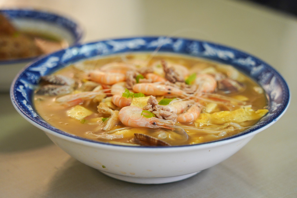 三鲜麦虾,用新鲜的虾加入蛤蜊鸡蛋皮,煮出鲜香的汤汁,再加入面条。