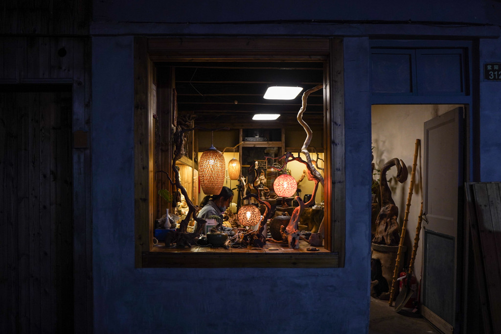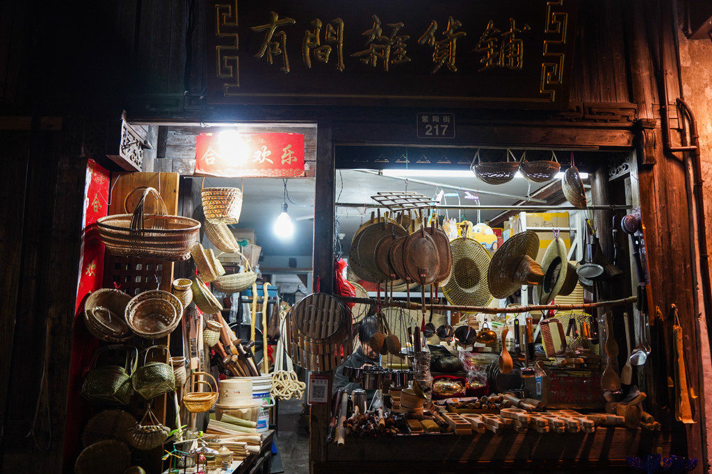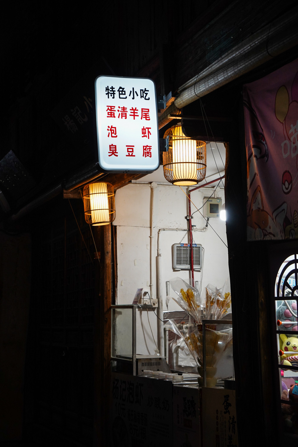 入夜的紫阳街,没有了白日里的喧嚣,只剩下安静。这里的店铺打烊比较早,但也有一些店铺还在开着,昏黄的灯光里面有手工艺者,小吃的摊主,但是游客依然络绎不绝,穿梭在这条古街里。