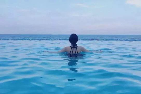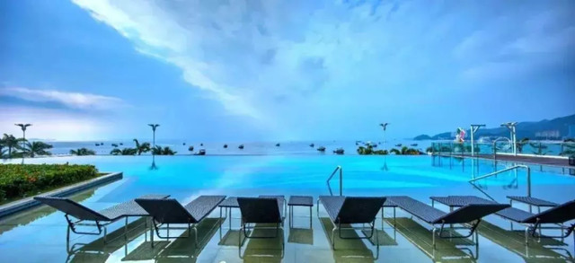 酒店无边际泳池躺在池边,因为看不到游泳池的边框,泳池和前面的大海,以及头顶上的蓝天似乎连在了一起,呈现海天一色的美景。在太阳照耀下,水波荡漾,清澈透明波光闪闪中,人的内心会变得极为安宁,尤其是夕阳西下之时大海的律动在浪涛中有规律的传来身心会逐渐的放松重新发现大自然本身蕴藏的美感。