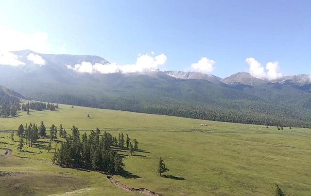 前往白哈巴村的途中,隔着玻璃拍的照片:大片的山林草场、篮天白云辽阔清爽。