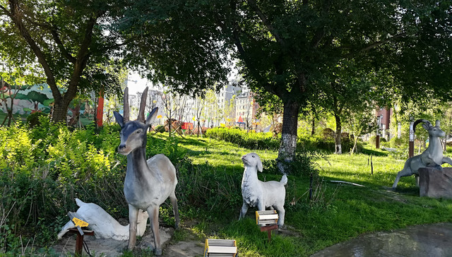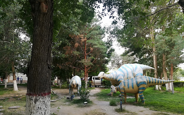 乌尔禾街道旁边有几个恐龙雕像造型。