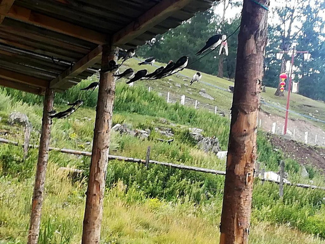 晚上我们就在这小木屋住宿,小鸟在屋檐下一边休息、一边交头接耳、窃窃私语。