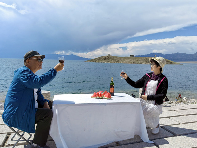 我们大巴车上带有折叠桌、凳及途中购买的水果等等,在湖边摆开正好适用。