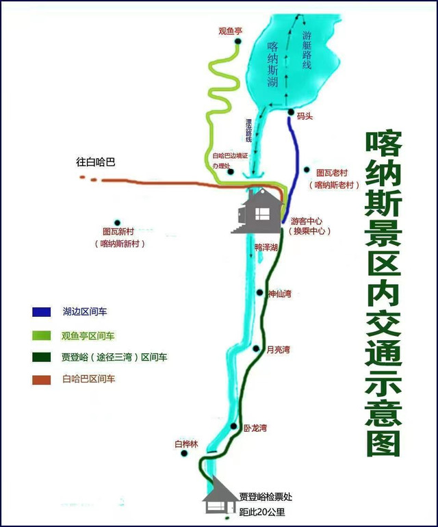 顺着喀纳斯老街的路步行不太远,就到游客中心区间车换乘站。