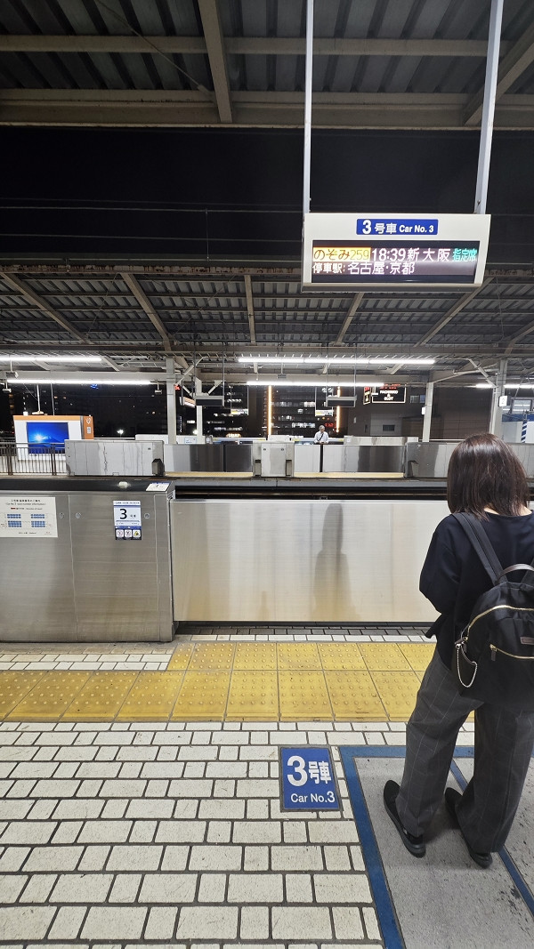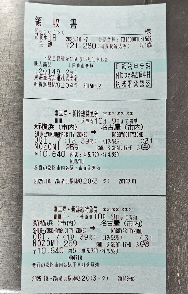 先到新横滨站买了去名古屋的车票(东海道新干线指定席,票价10640円/人),售票处有美女帮忙,选择了18:39那班车的3车厢17D和17E两个席位(车厢最后一排,座椅后可以放行李箱,这是仅剩的最后两个可以放行李的联排座席了,非常感谢美女帮忙)。