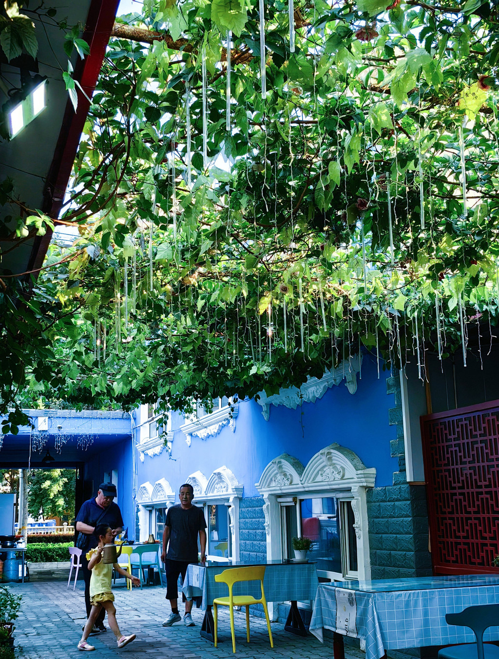 成片的蓝色房子、开满紫色槐花的小路、阳光下的长椅、围墙上的鸽群,又安静又舒服,开心到一路都在哼着歌。