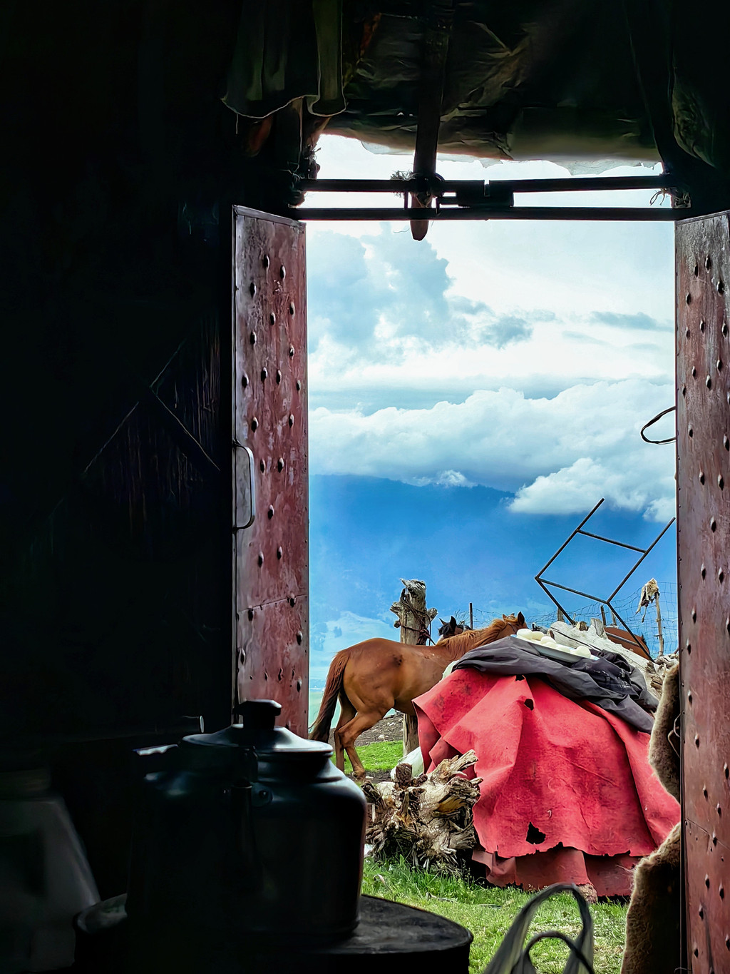 山顶的夏牧场,在为数不多哈萨克民族自己生活的毡房里歇息。主人拿出自制的包尔萨克、哈萨克馕、奶疙瘩,现煮了奶茶。