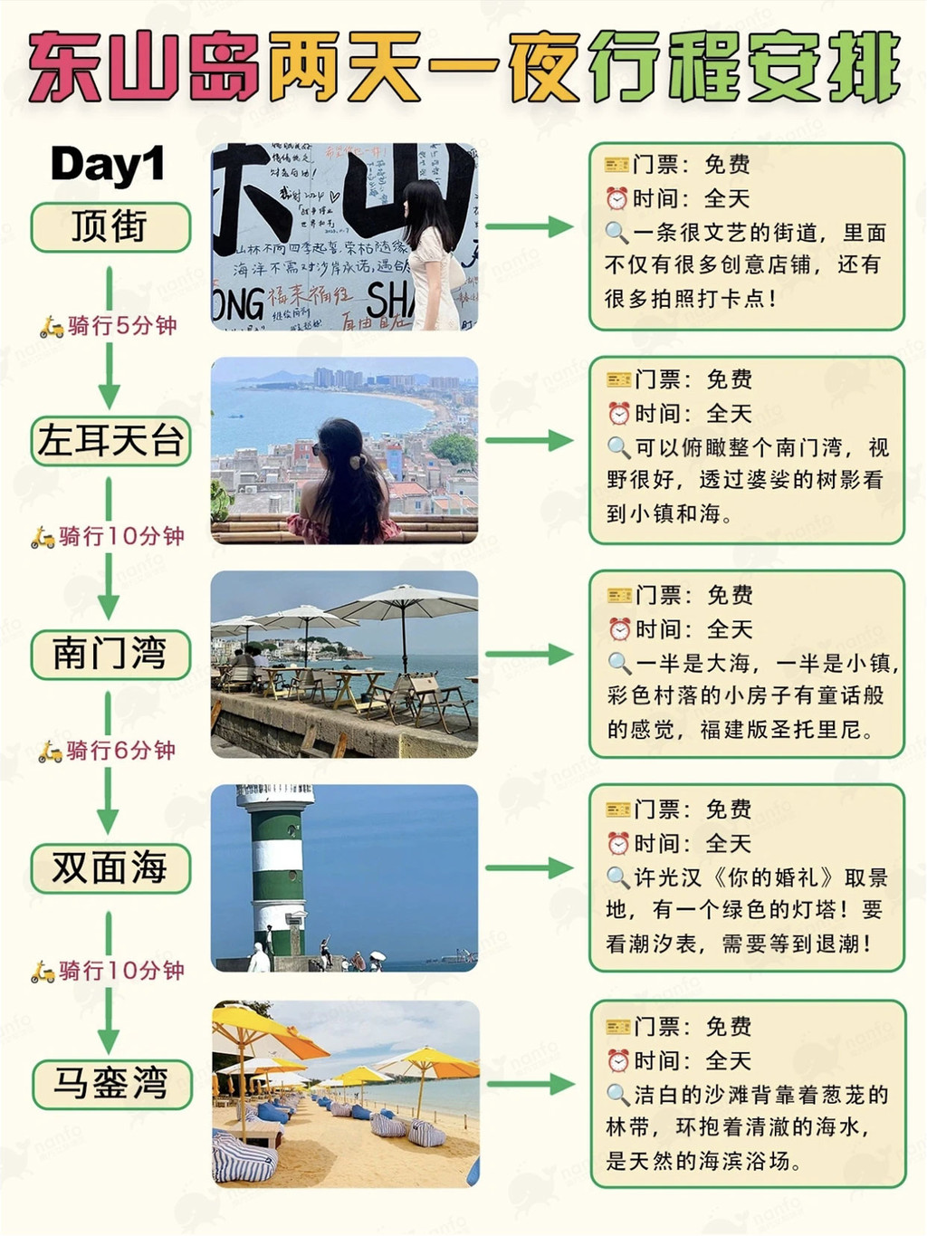 Day1:从顶街出发,骑行5分钟到左耳天台俯瞰南门湾,再前往南门湾和双面海感受海天一色,Zui后在马銮湾享受洁白沙滩。🏖️