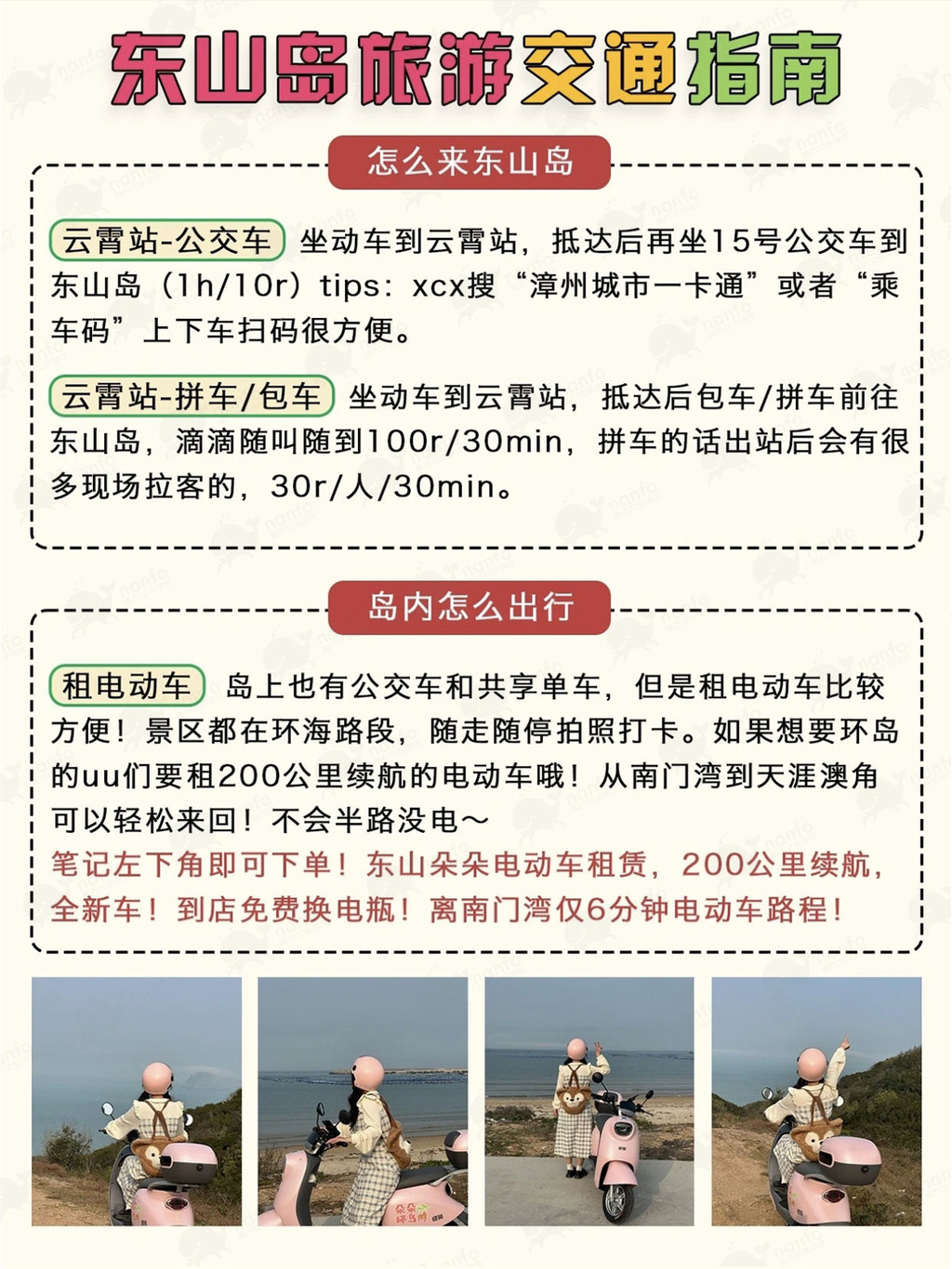 从云霄站坐动车抵达东山岛,再坐15路公交车或拼车前往目的地。岛内建议租电动车,方便随走随停,欣赏沿途美景。🌊