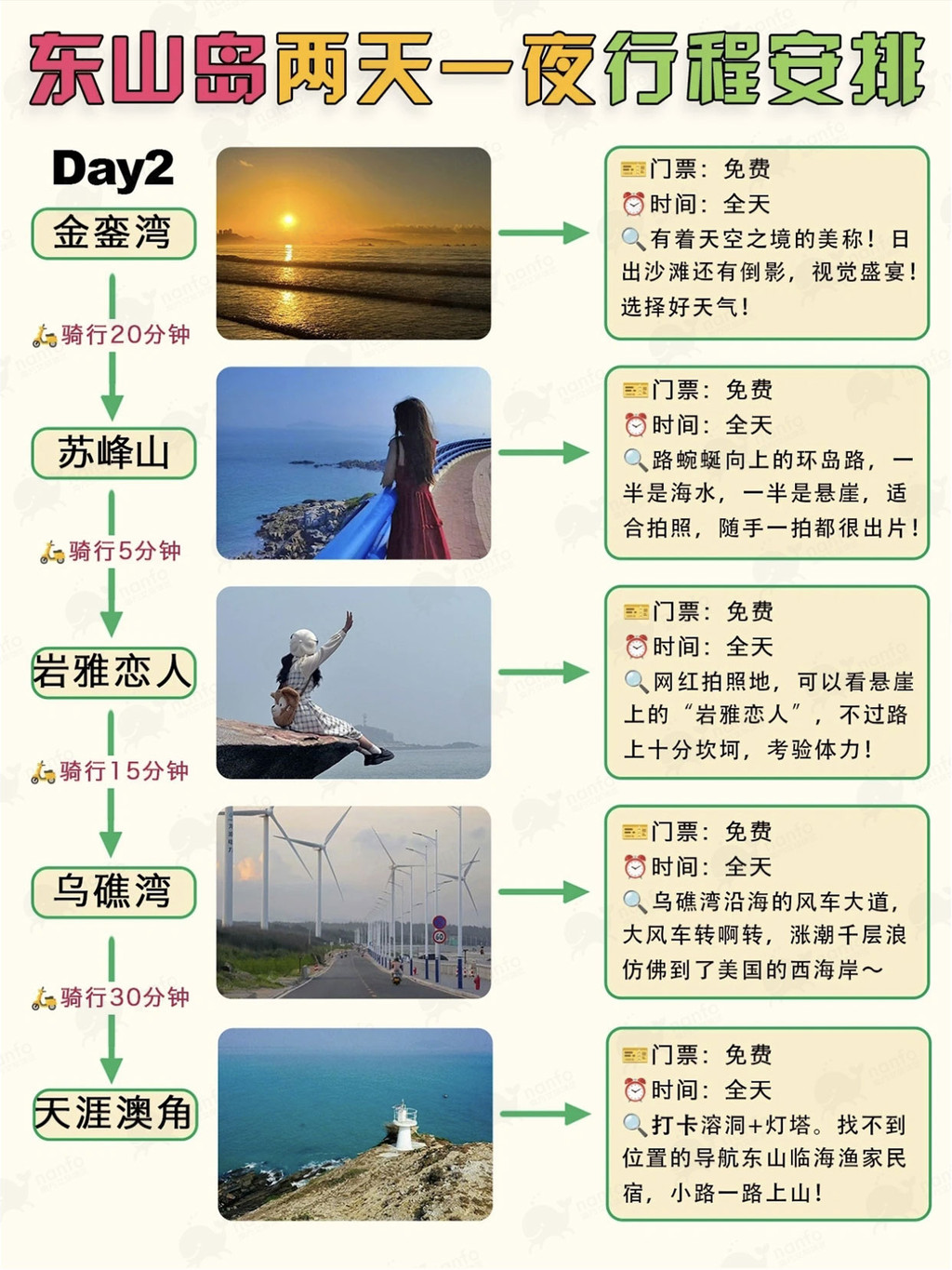 Day2:前往金銮湾观赏日出,骑行至苏峰山环岛路拍照打卡,接着探访岩雅恋人,Zui后在乌礁湾和天涯澳角感受浪漫日落。🌅