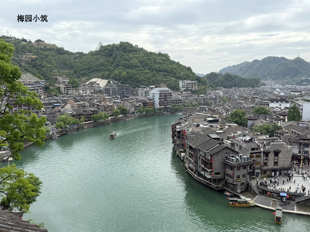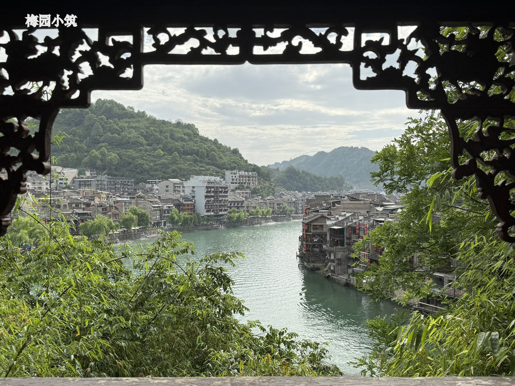 望江楼确是观景绝佳处。凭栏远眺,整座镇远古城尽收眼底——对岸炊烟袅袅,黛瓦鳞次栉比,新大桥如白练横跨碧水。更妙的是楼内的人文风景:三位本地老人占据着临窗的竹桌,正就着一壶雷公山茶下象棋。穿着汉服拍照的姑娘们倚着美人靠,裙裾被风吹得翩跹起舞。有位老者此刻正在角落默写《清净经》,蝇头小楷在宣纸上如行云流水。