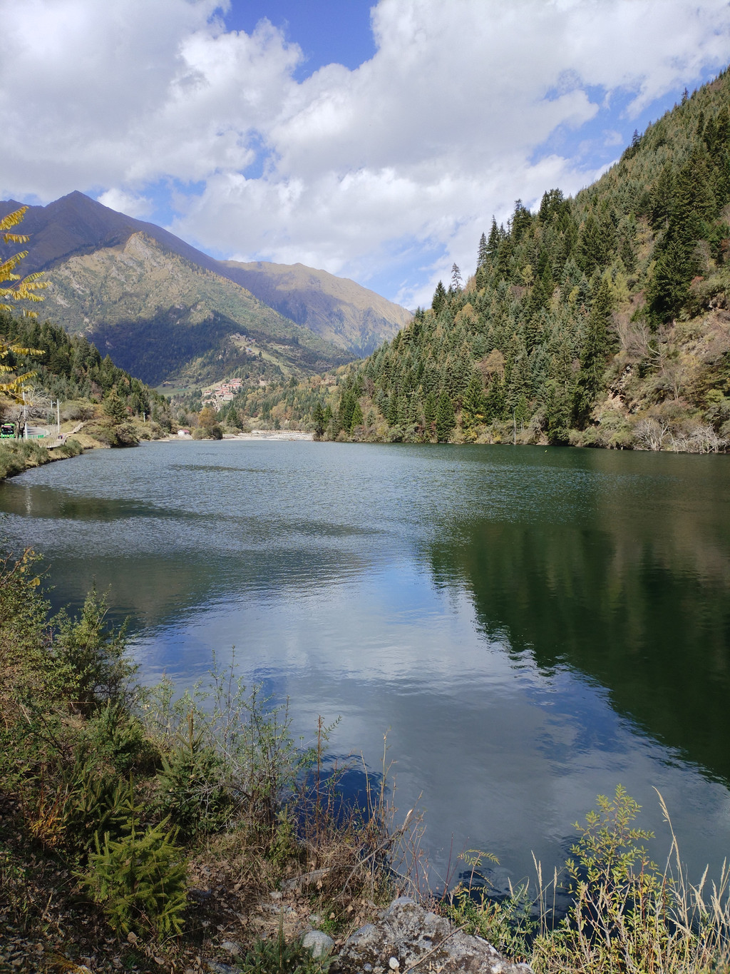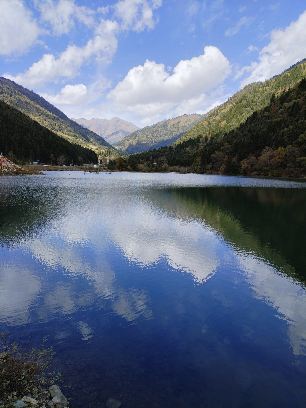 我们是中午时分到达景区的,然后坐观光车去索道站。那天是晴天,阳光和煦,达古河两岸山坡上的树林换上了五彩缤纷的秋装,堆红叠翠,格外绚丽夺目;沿途经过的那些湖泊,湖水清澈碧绿,倒映着蓝天白云,倒映着两岸多彩的树林。司机师傅每开到一个景点,就会停车让我们下去拍照,过一会儿就会大喊:上车啦!我们就上车继续前进。