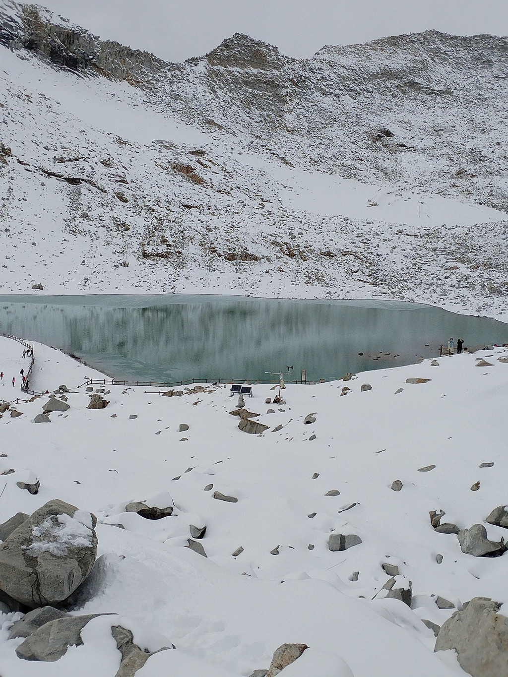 过去达古冰川地区每年只有两个月没雪,现在这个无雪期长达三四个月了。夏天时,泪湖周围的冰雪全部消融,只剩下光秃秃的大大小小的岩石;等到秋天来临,气温下降,泪湖才能重新回到冰雪的怀抱;冬天到来时,泪湖就会和周围冰雪连成一体,变成冰湖;直到来年春天,它才又变回泪湖。