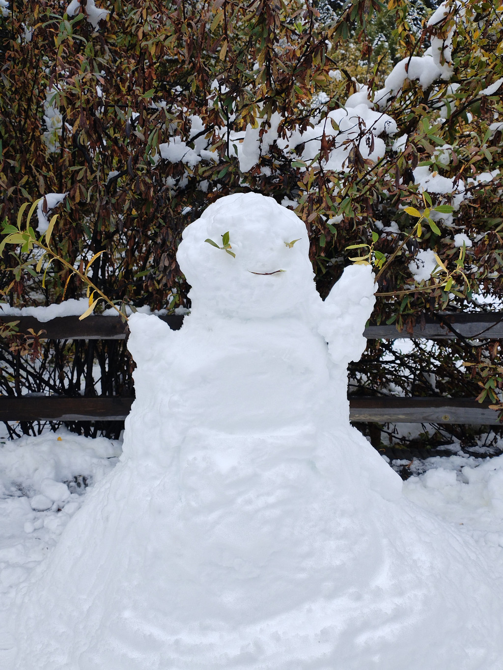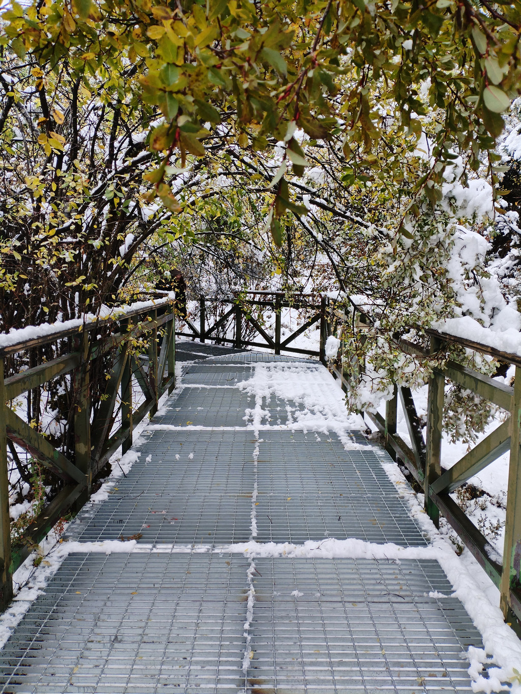 次日早上,我们去得更早,八时许就坐上了去扎灌崩的观光大巴。出发时是阴天,可车刚开到山上,窗外却是漫天大雪,山坡上的树木昨天还是一片绿一片黄的,现在全部变成白色。司机开了一会儿后就停下车,取出防滑链,仔仔细细地给轮胎装上,然后再慢速前行。昨天开到扎灌崩只要一个小时,今天却用了两个小时!昨天是阳光灿烂,今天是大雪漫天!稻城亚丁的天气,真善变!