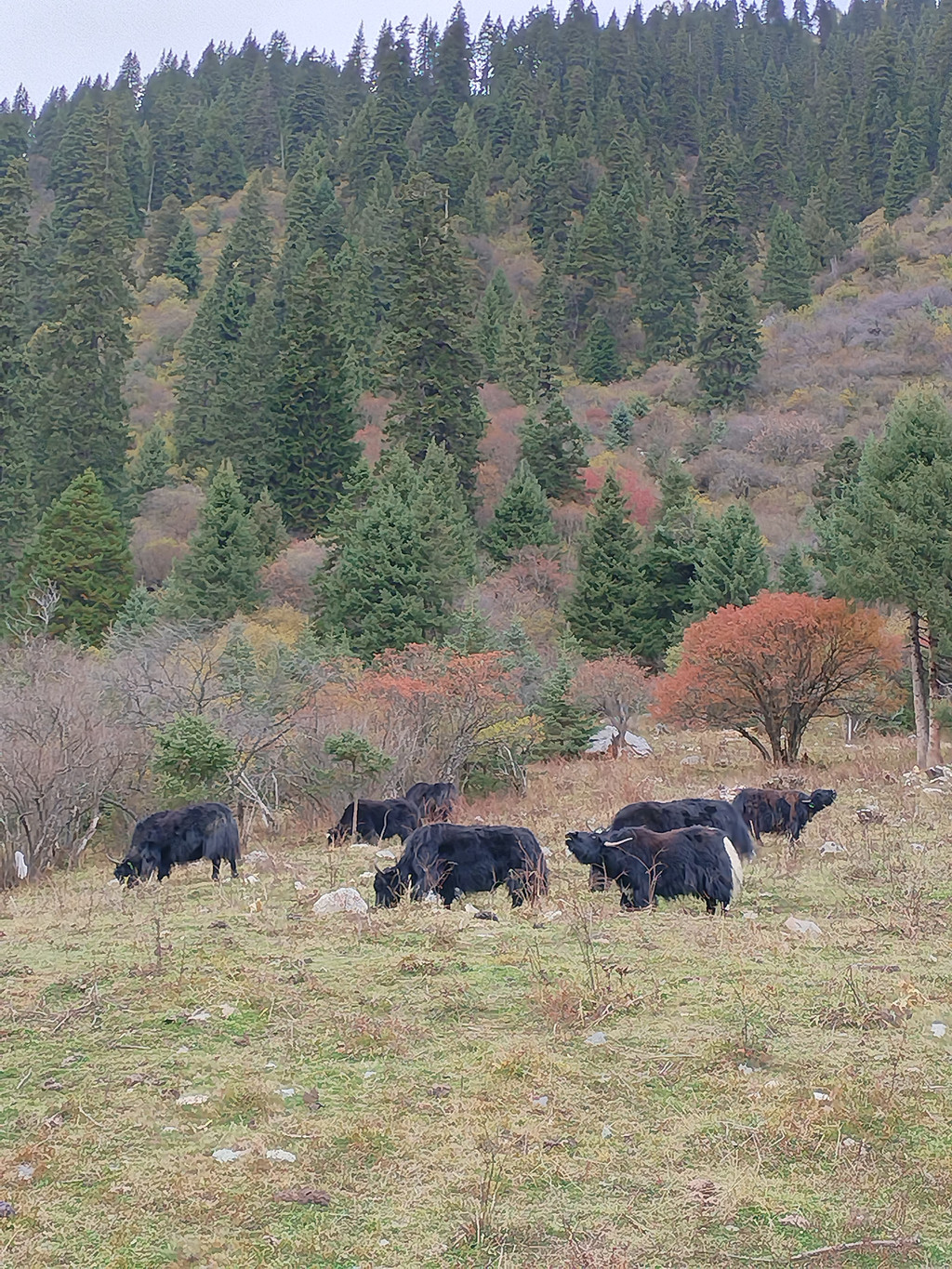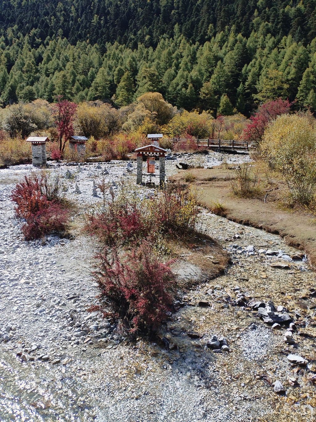 栈道两旁树叶金黄的灌木越来越多,形成一条金色道路,引导着阿李不断前行。阿李不时地停下来,拍黄树拍红树拍绿树,拍溪水拍草甸拍雪峰,拍树枝上嬉戏的小鸟,还要拍看到人就出来讨食的小松鼠……才走到圣水湖,离洛绒牛场还远着呢,时间竟然到了下午两点多,两位团友已从洛绒牛场回来了。他俩见阿李还想往上走,就劝阻道:上面的景色和这里也差不多,现在应该回去了,我们团规定集合的时间是下午五点哦。