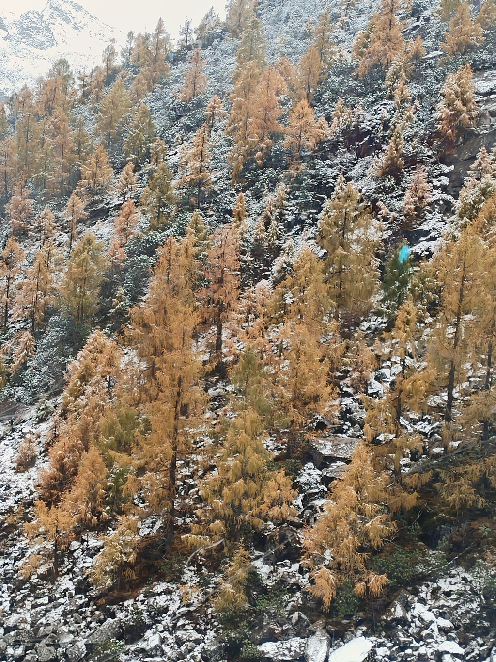 按照计划,阿李今天的目标是右线的珍珠海。于是一边努力攀爬一边尽力拍照——这么美的雪景谁能忍住不拍呢?好不容易才从扎灌崩走到了冲古寺上面一点,阿李就遇到了从珍珠海返回的一位团友。他说珍珠海还远得很,领队已在微信群里喊大家下山了,中午一点景区门口集合,过时不候。阿李看了下时间,已是上午十一点,而回去的车程至少要一个小时,只能转身往下走了。此时栈道两旁金黄的树木被白雪压弯了腰,竟然连接在一起,形成了一条金色的隧道,而枝叶上的积雪不时簌簌落下。阿李就弯腰在这金色的隧道中穿行,虽不时被落雪击中,却乐在其中,一点都不觉得腰疼腿疼。