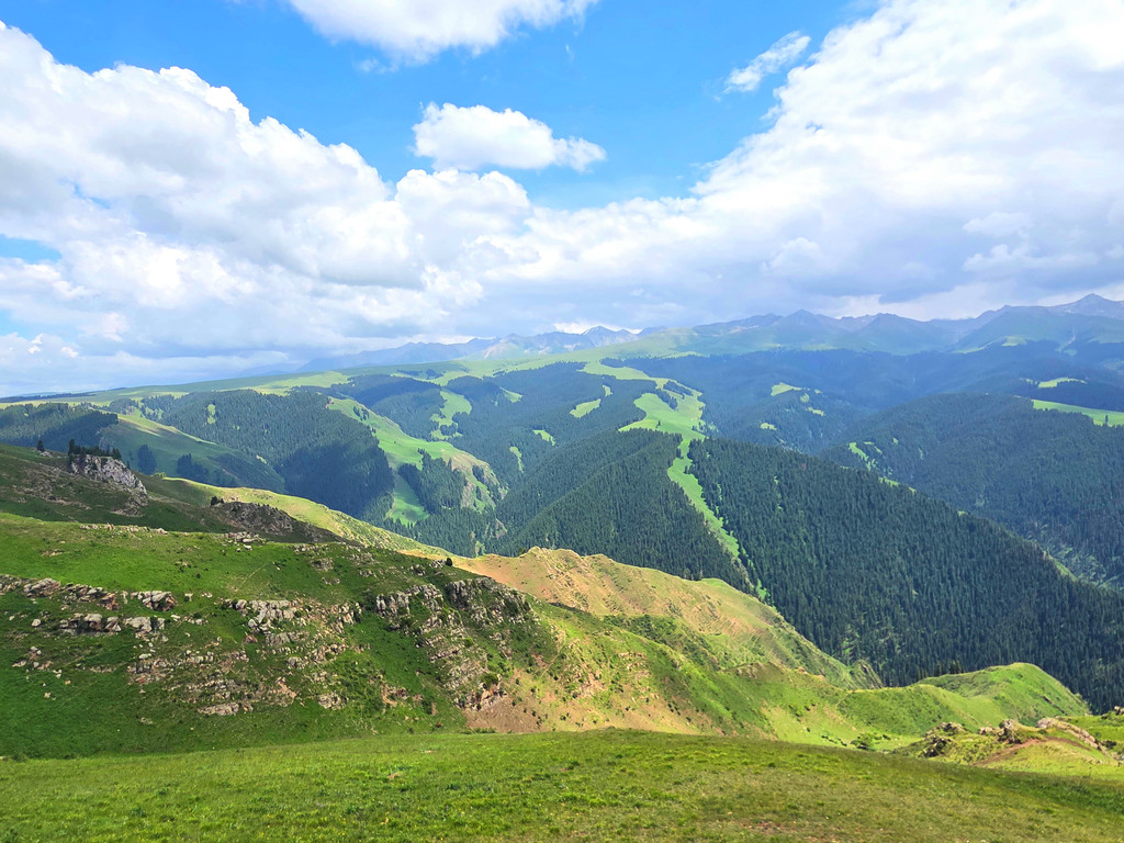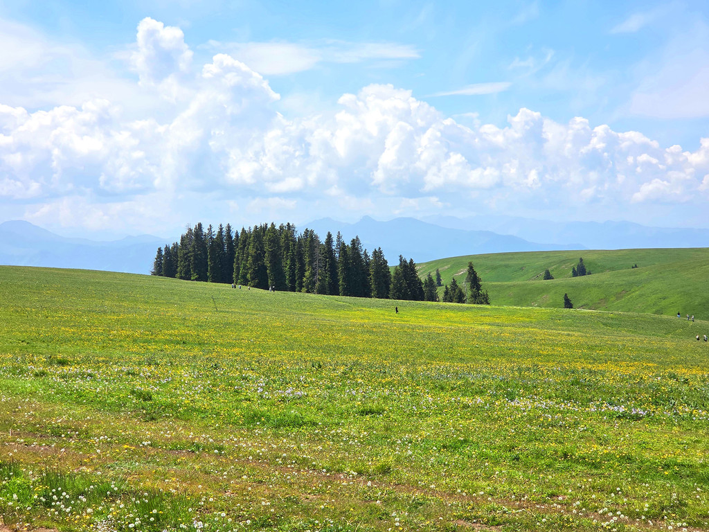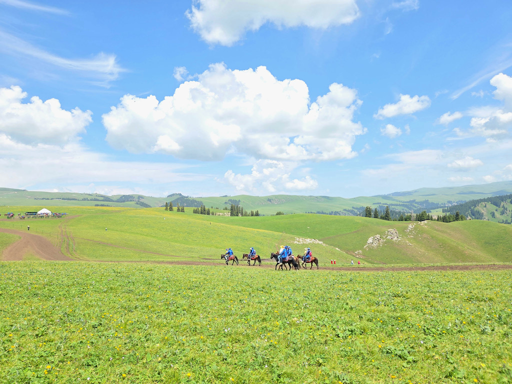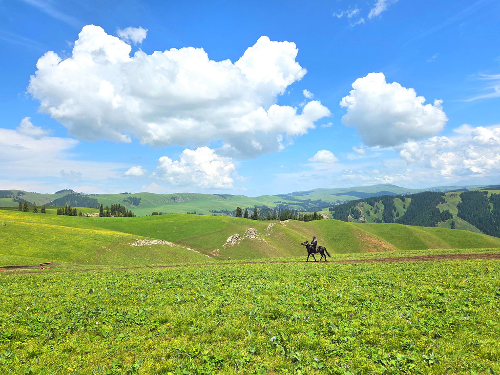 今天真的十分幸运,美好的一天不期而至,从清晨到傍晚的天气都特别好。雨后天晴的草原上蓝天白云、微风轻拂;空气新鲜、沁人脾肺;置身其中,甚为惬意;为喀拉峻大草原一日游增色不少。我们一行精神抖擞,游兴十足,从早上出发一直游玩到傍晚才回到酒店,其间仅徒步游览时间就有7个小时之多。虽游人非常多,但草原足够大,使得大家能够分散到四面八方去,让你也能获得美好舒心的旅游体验感,特赞!