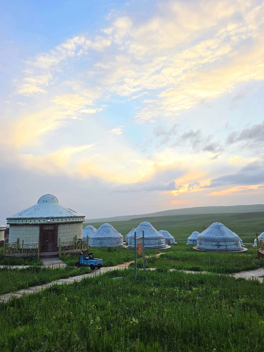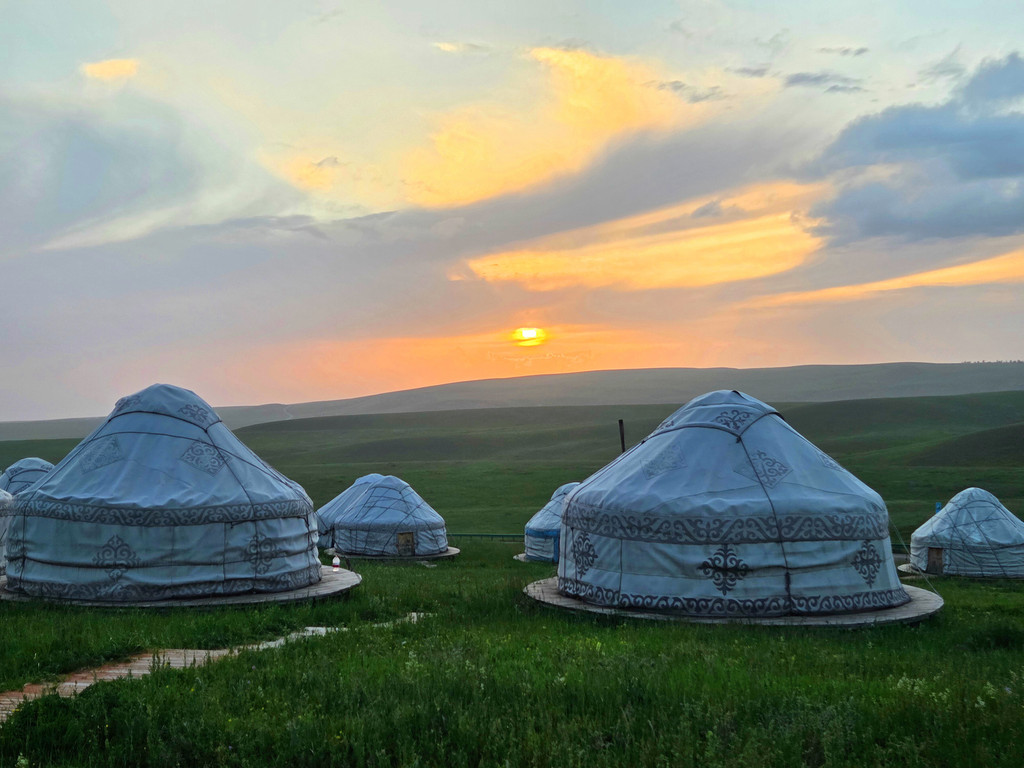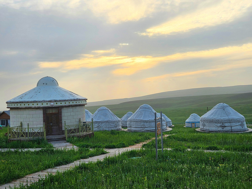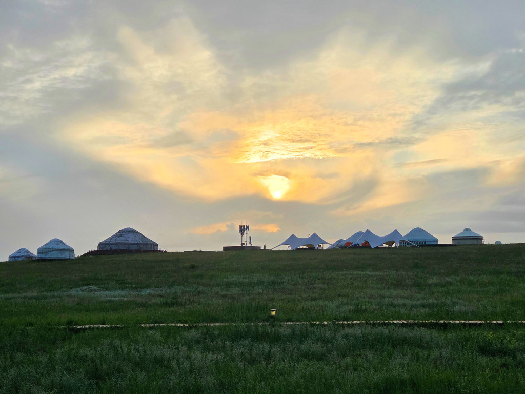 草原上的天气瞬息万变,到了傍晚时分,天气终于变得非常好了。这时,晴朗的天空,辉煌的落日,美丽的晚霞、白色的毡房、远处的山峦交相辉映,构成一幅幅如梦如幻的绚丽画卷。夕阳下的大草原显得格外妩媚,让人目不暇接、心旷神怡。这也算是把住宿选择在景区里草原上最大的福利和最好的回报吧。