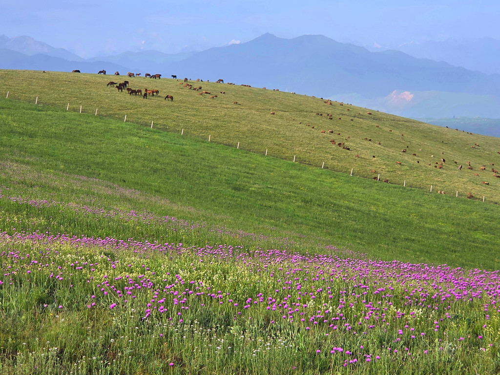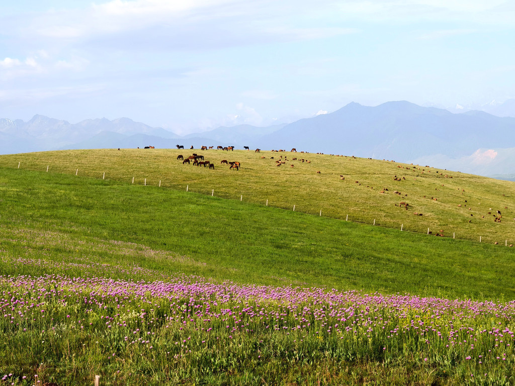 这次在喀拉峻游览也有美中不足的地方,就是远景中能见到的雪山不多。据了解,今年因天气因素的影响,到了6月份,雪山上的积雪已消融了许多,所以从草原上放眼望去,原本白雪皑皑雪山不很明显了。没有雪山的衬托,景观的层次感就逊色了许多,这个情况在其它景区景点游览的感觉也然。