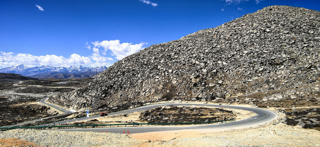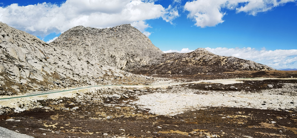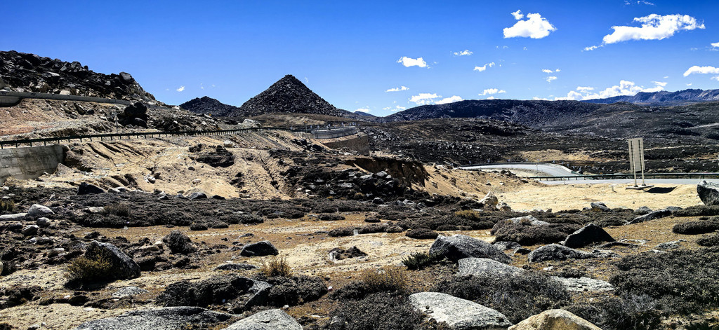 离开纳海又是爬升山路,景色越来越荒凉。不久就到了格聂南线反穿的最后一道“天门”—铁匠山垭口。垭口地势开阔,两侧的山体越来越多的被石块、石片覆盖,呈灰褐色,表面布满风蚀的痕迹,宛如铁匠锻造的铁器般粗犷。站在垭口,向南望去,格聂神山主峰(海拔6204米)巍峨挺拔,雪线以上则覆盖着皑皑白雪,在阳光下闪烁着圣洁的光芒;雪线以下是深褐色的岩石。站在高处一眼望去,满眼都是碎石,整个垭口像是一个巨大的碎石场,荒凉惊恐。