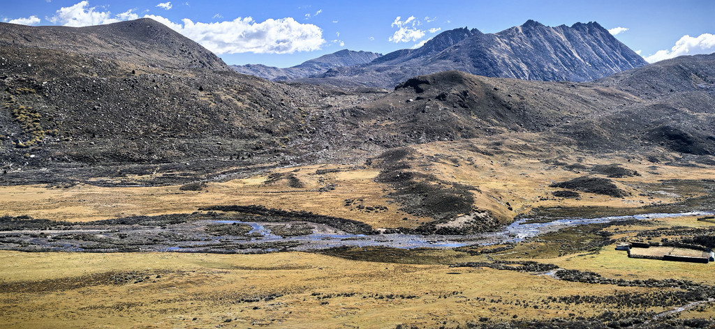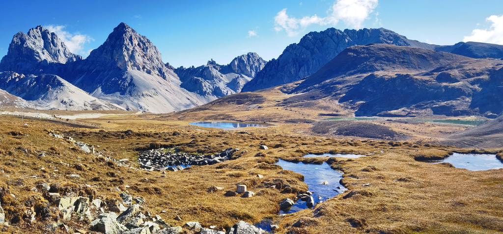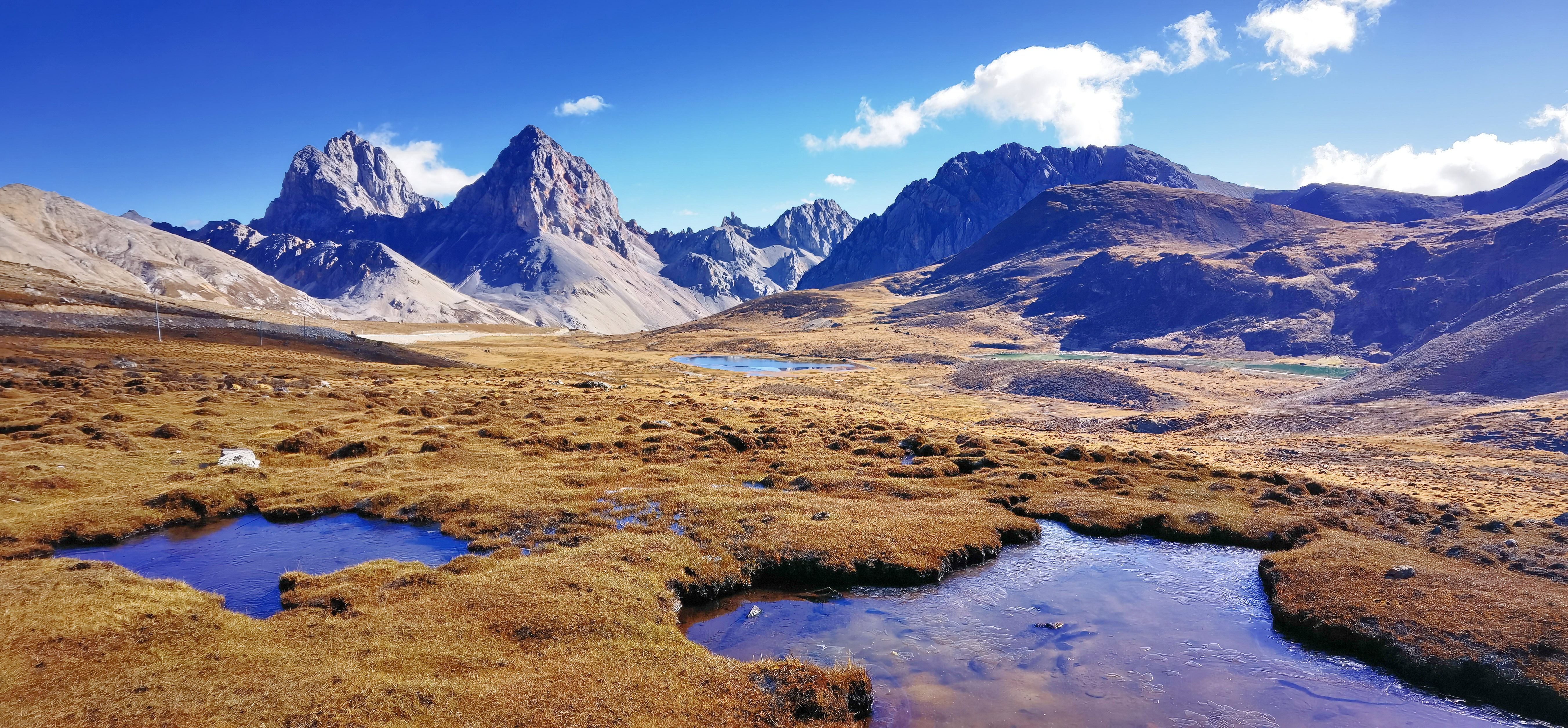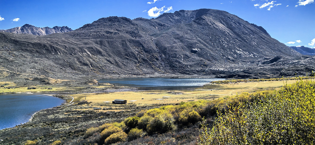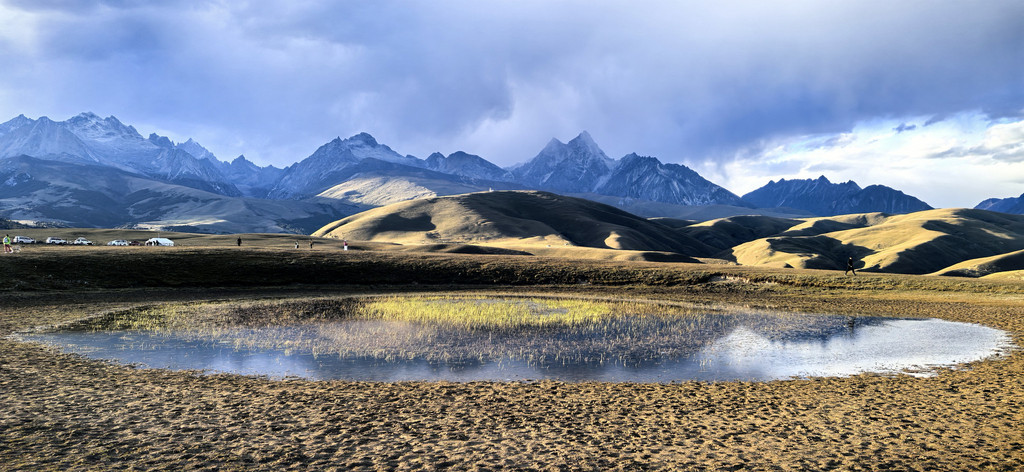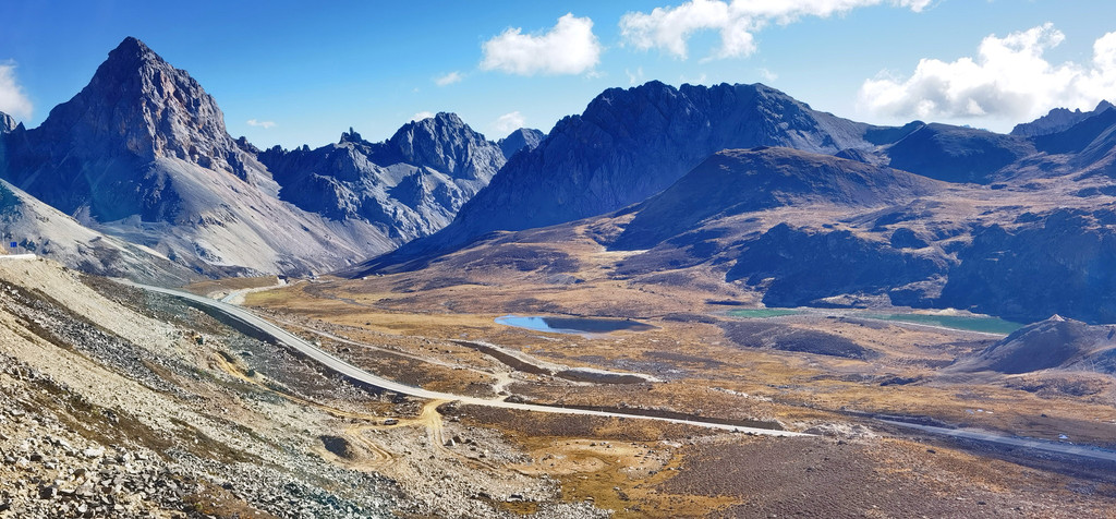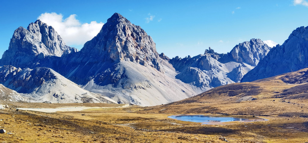 是格聂南线反穿途中海拔最高的垭口,景色带着原始的粗犷与凛冽。碎石与泥土混合的陡坡直插天际,车辆碾过松动的砾石,在晨曦中艰难攀升。上午的阳光从雪山的背后直射过来,很是刺眼,雄伟的山峰围绕着我们,带有一点点凶意,让人心生胆怯却又好奇。两个尖尖的山峰并列驻足,山峰寸草不生,灰褐色的岩体勾勒出一副“地狱之门”阴森景象。山坳里却铺着金黄色的草甸,草甸中镶嵌着碧蓝的水潭,如同宝石洒落在地毯上,给这苍凉的扎瓦拉平添了一些浪漫和美好。