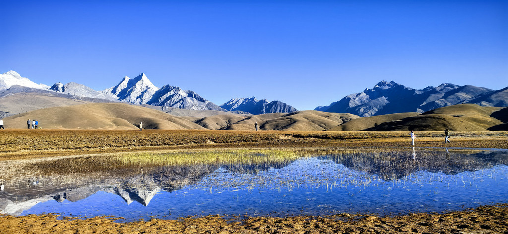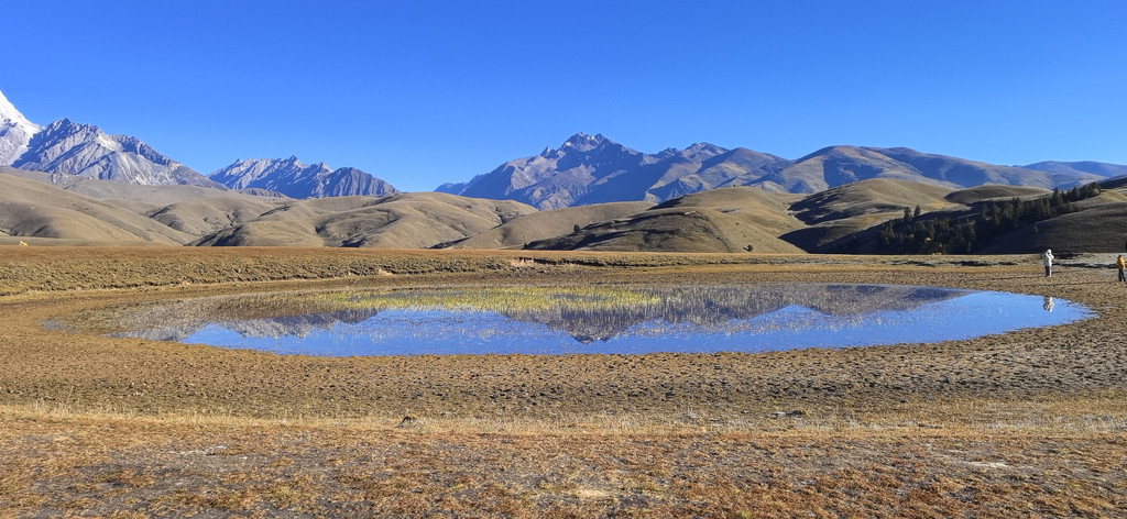 格聂之眼是格聂南线的灵魂所在——一个直径数十米的圆形海子,镶嵌在高山草甸中央。从空中俯瞰,海子的轮廓宛如一只巨大的眼睛,瞳孔处是深邃的蓝,虹膜则由一圈圈浅绿色的草甸环绕,而格聂神山主峰恰好倒映在“瞳孔”中央,形成“神山凝视大地”的奇观。湖水清澈见底,倒映着天空的白云与神山的白雪,仿佛天地在此交融。我们抵达时,天气晴好,格聂神山主峰清晰地倒映在“瞳孔”之中,景象蔚为壮观,令人叹为观止。我们在这里停留了很久,尽情地拍照、欢呼,感受着大自然的神奇与伟大。格聂之眼的后山顶处修建了观景台,但距离较远,海拔较高,鲜少有人徒步去观景台瞭望格聂之眼。傍晚和早晨光线相对柔和,是两个最佳拍照时间。我们有幸欣赏了这两个时间的格聂之眼,美不胜收。