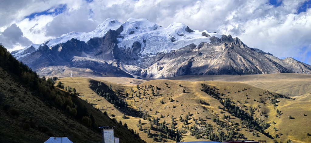 接下来的搓板炮弹坑路让我们精神分外紧张,但是同行大姐高超的驾驶技术让坐车的人有了另一番驾趣。这段路走完,大家松了口气,想找个地方停车休息一下,一转头,路边的土坡上,峰回路转,格聂雪峰就在头顶,夯达营地就这样在我们毫无准备的情况下出现在面前!