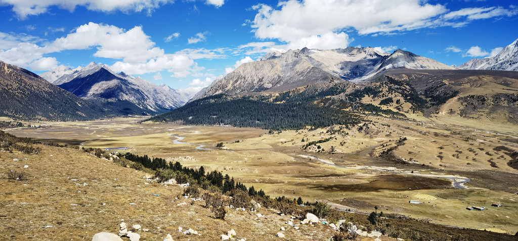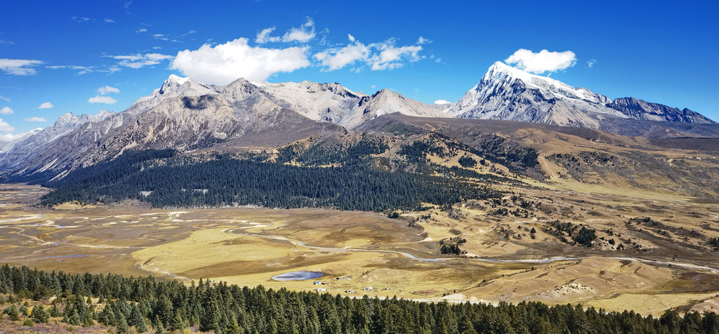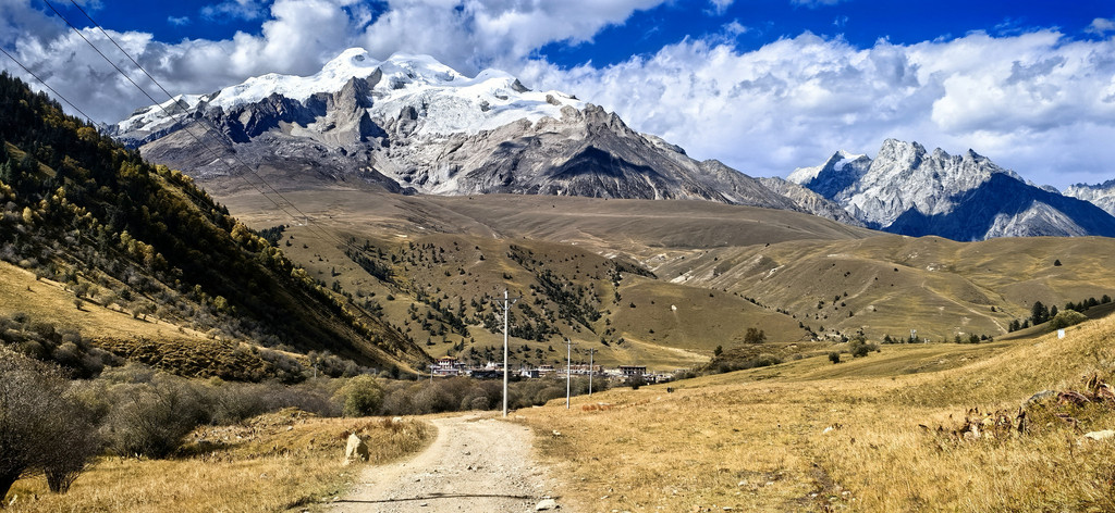热梯河谷是格聂南线中最具“烟火气”的秘境。整个河谷被金色铺满,期间流动着的溪流像是一条栖息在山谷里的长龙。河谷深处,藏式夯土民居洒落期间,墙体上的彩色图腾与经幡随风飘动,与周围的自然景观融为一体,远处的雪峰静静地守卫者自己忠实的子民。