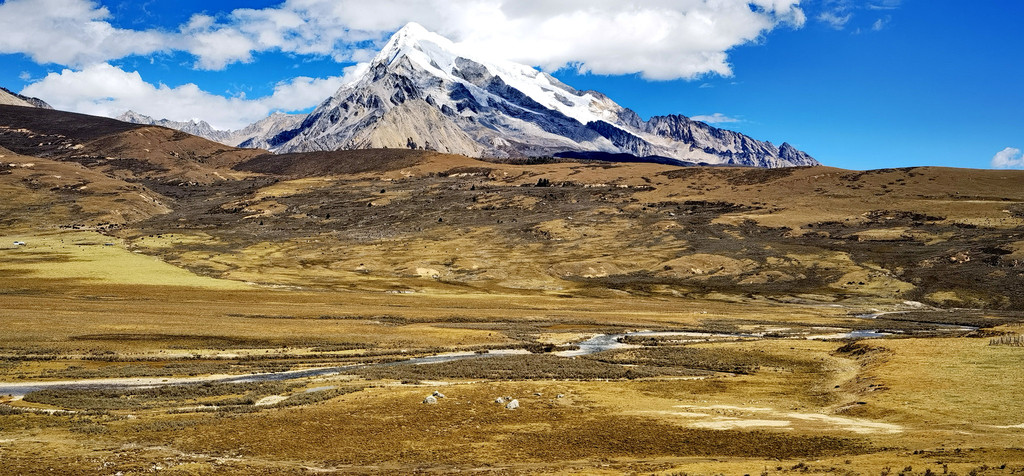 行走在则巴村的小路上,前后都没看到任何人,天地间只有自己和格聂神山共存,听着自己的喘息声,终于有些能理解“行走的力量”。时间仿佛放慢了脚步,原始与宁静是这片秘境最动人的底色。小路的尽头有条小溪,木制的小桥上挂了五彩的经幡,向旁边的玛尼堆静静地招手。我们从路边的山坡小路爬山了山头,仰望蓝天,向格聂神山致敬!