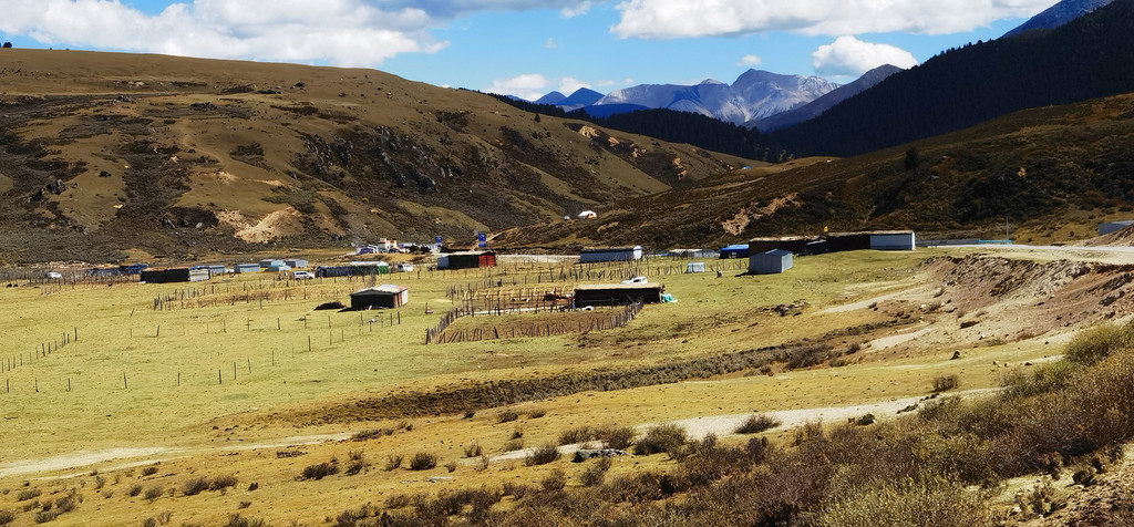 车子继续在山间爬升。沿路看到了建在山坡上的格聂自然中心小木屋,面对雪山,悠然自得。现在是旅游淡季,小木屋孤零零的伫立在山间,没有一个住客。