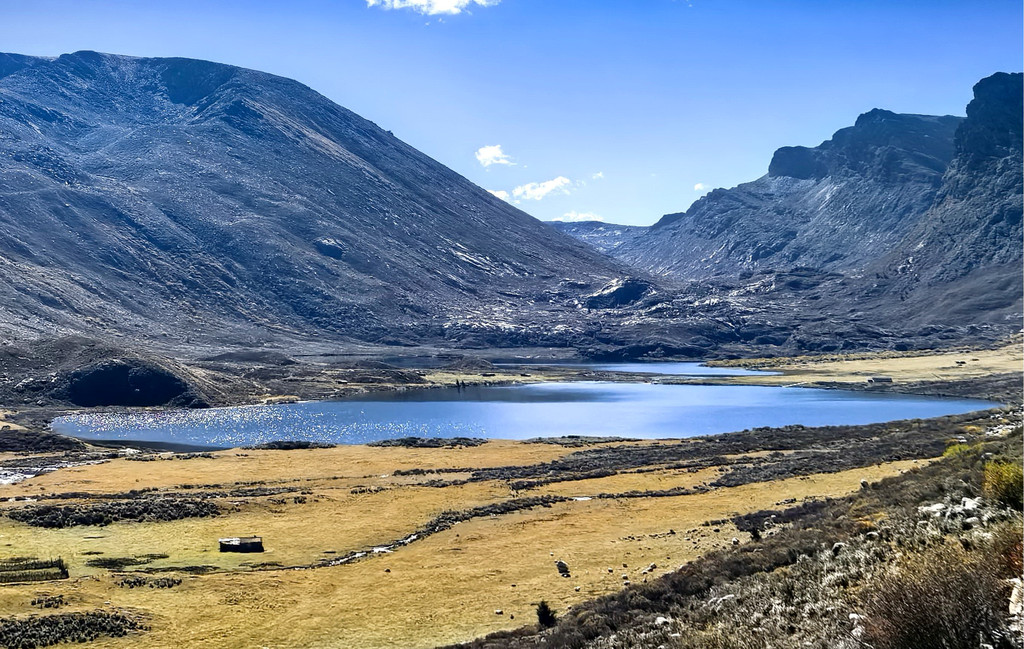 纳海藏于格聂神山腹地,是一处鲜为人知的高山湖泊。它的入口在山路的一个大拐弯处,很容易被错过。车程5分钟就到了尽头。格聂纳海与川西理塘的姊妹湖均为双湖相连景观,但各具特色。
