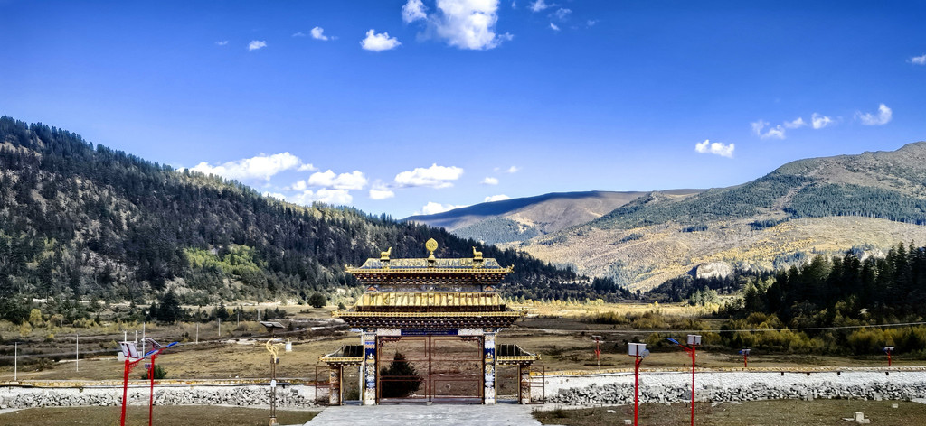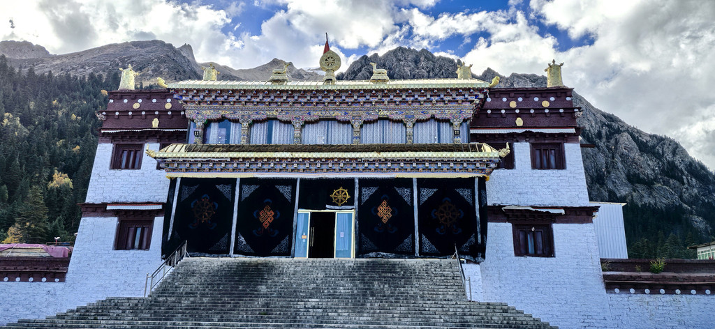 新冷古寺于2005年修建,海拔较低,主体建筑包括大雄宝殿、活佛殿、藏经阁等,屋顶覆以鎏金铜瓦,阳光下熠熠生辉。寺内供奉着格聂三宝,其中以“格聂之心”(一块天然形成的形似心脏的奇石)最为著名,被信徒视为神山的象征。新冷古寺内设有修行院,很多僧人在此闭关修行,同时对游客开放,让访客体验藏族文化与宗教氛围。僧人们都很和善,参观时正逢僧人集体诵经,我第一次和个别信徒一起静静地坐在经堂里旁听,有些灵魂飞升的感觉。僧人的诵经会使用很多乐器,能看懂的有:法铃、手鼓、大鼓、筒钦、木鱼等,还有很多都没见过,他们还会有领诵的,声如洪钟,非常震撼。