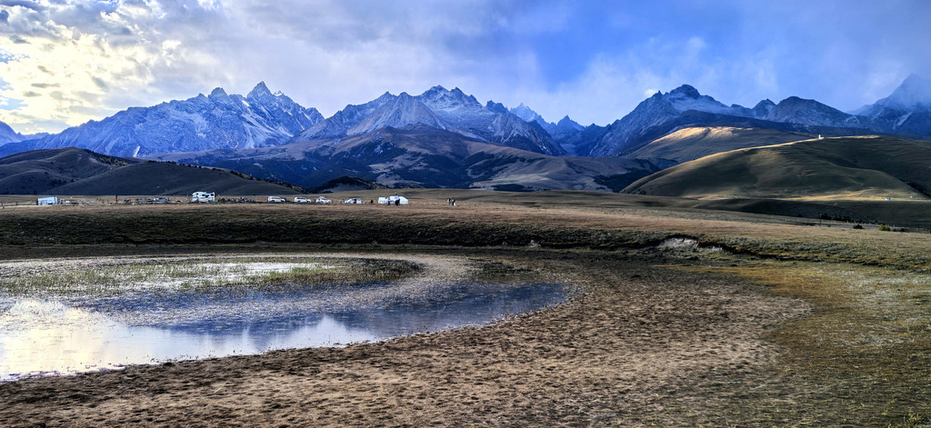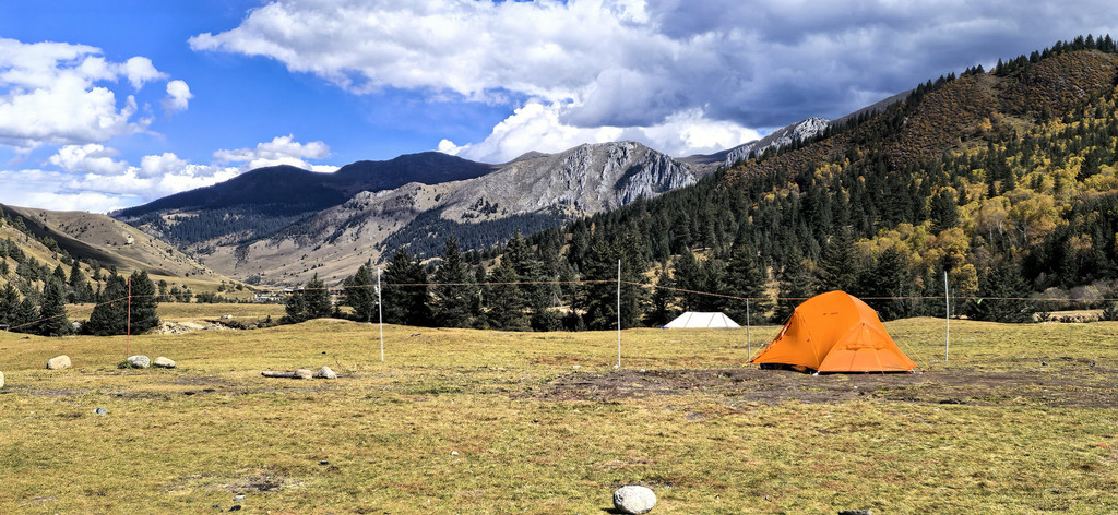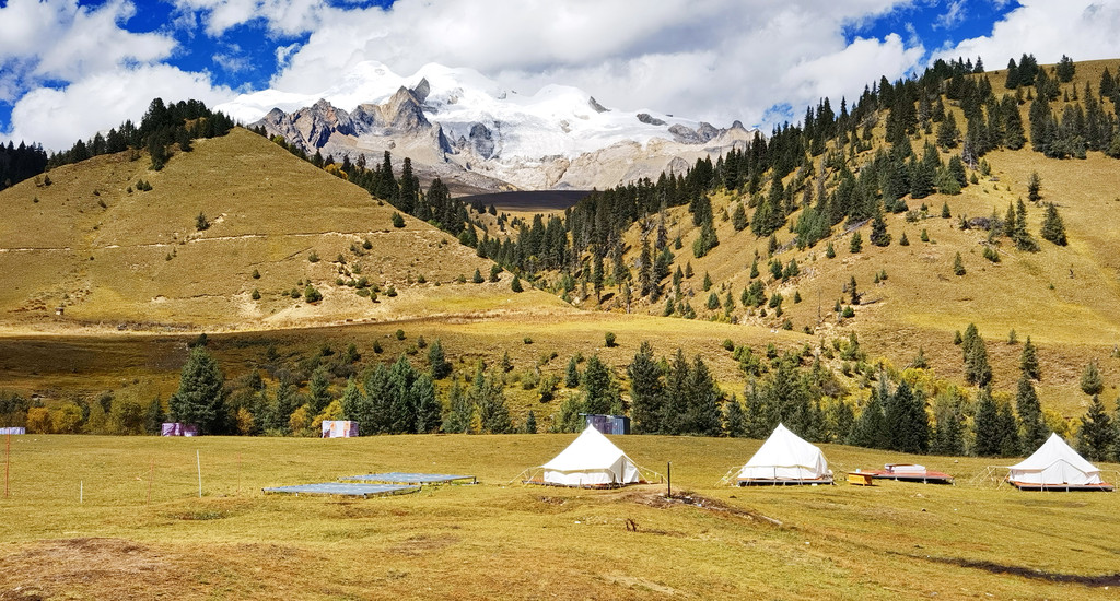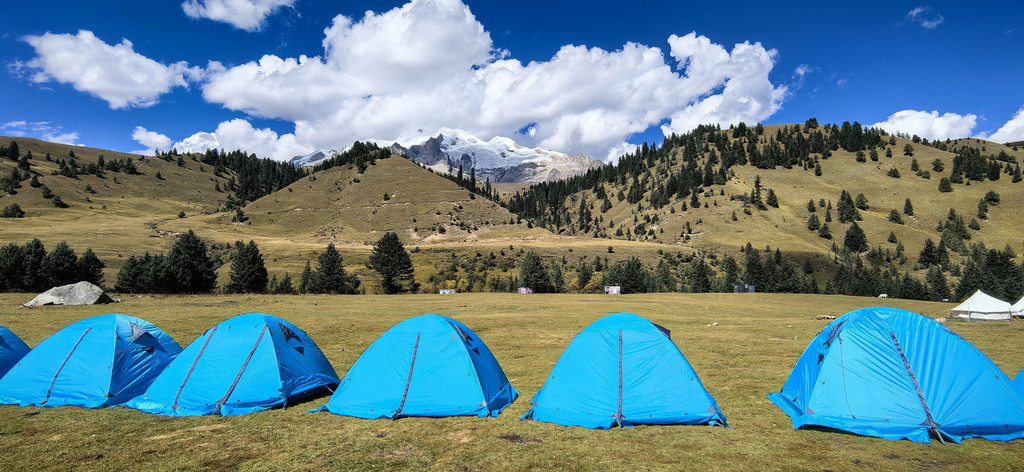 土坡上是一大片草原牧场,四周雪山环绕,几匹马儿在山坡上散步,蓝色、白色、黄色的帐篷搭建在牧场上,这里就是被誉为“徒步者与露营爱好者的天堂”的夯达营地。营地正对格聂神山南坡,360度无遮挡视野,格聂南坡的雪峰明晃晃的就在眼前,让人激动。这里有牧民提供简单的露营服务,比如帐篷租赁、简易卫生间、简餐食物等。我们在这儿尽情撒欢。