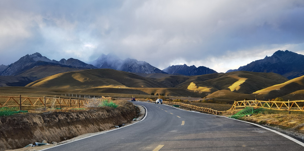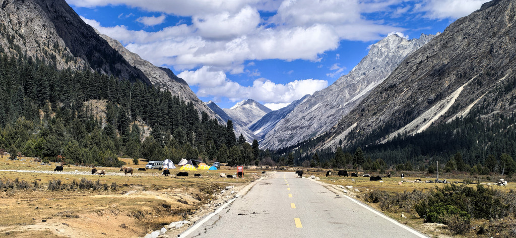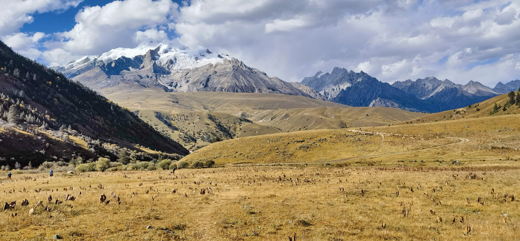 公路在草场中蜿蜒至远方的高山。相较于扎瓦拉垭口的险峻,劳者龙巴垭口更显开阔。垭口两侧是起伏的高山草甸。垭口处地势平缓,远处的雪山群峰就在眼前,高大巍峨。山谷间流动的不仅是溪流,更是光影和色彩。这里的风虽不及扎瓦拉垭口狂暴,却带着高原特有的清冽,吸一口空气,满是青草与泥土的气息。站在垭口远眺,热梯河谷的轮廓在山谷尽头铺展。