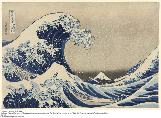 葛饰北斋的版画《神奈川冲浪里》可以说是欧美博物馆界的“爆款”。芝加哥艺术博物馆收藏有3幅,保存状态良好。《神奈川冲浪里》同时也是日本浮世绘时期最具代表性的作品之一。绘画应用普鲁士蓝(Prussian blue)呈现浪花中分明的层次变化,运用弧线和短线条对比勾勒出充满张力的巨浪和跳跃的浪尖。