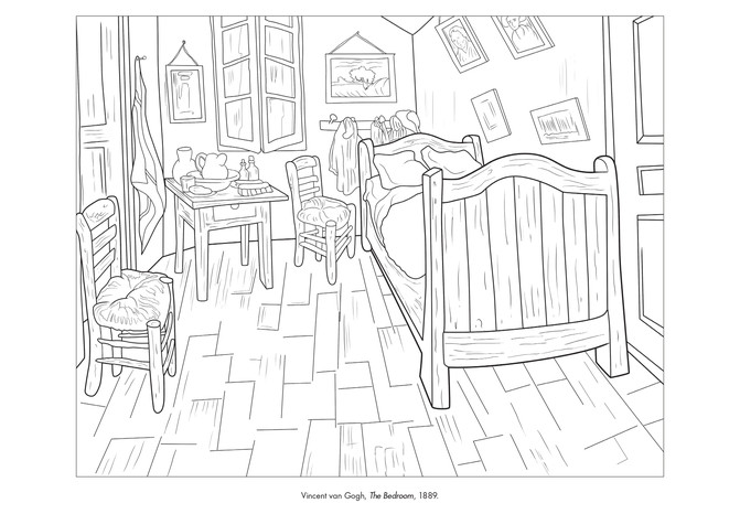 1888至1889 两年间梵高总共画了三个版本的《卧室》。在搬到阿尔勒后,梵高第一次拥有完全属于自己的家。他十分高兴于此,并精心打点了卧室,他使用厚涂的笔法,采用大量不同的色彩来渲染房间。在跟弟弟的信中,梵高提到自己希望用这些截然不同的色调来表达一种彻底的宁静。然而,虽然《卧室》对作者自己来说象征了超然的静谧、闲适和安宁,可事实上过于斑驳的色彩,粗糙的地板和由极度向下倾斜造成的奇特空间感,充满紧张、不安、和混乱,让人不由心身焦躁和压抑。
