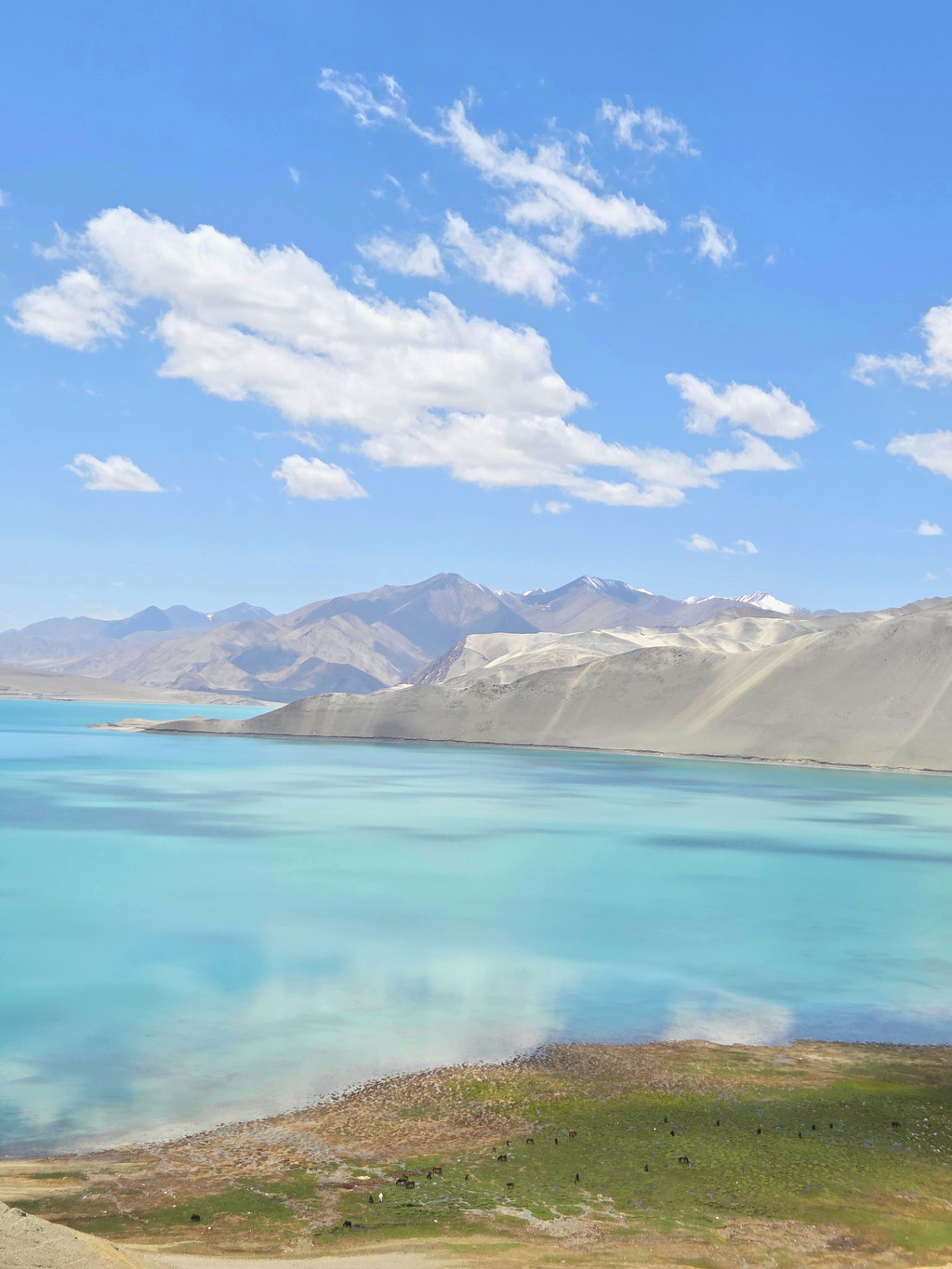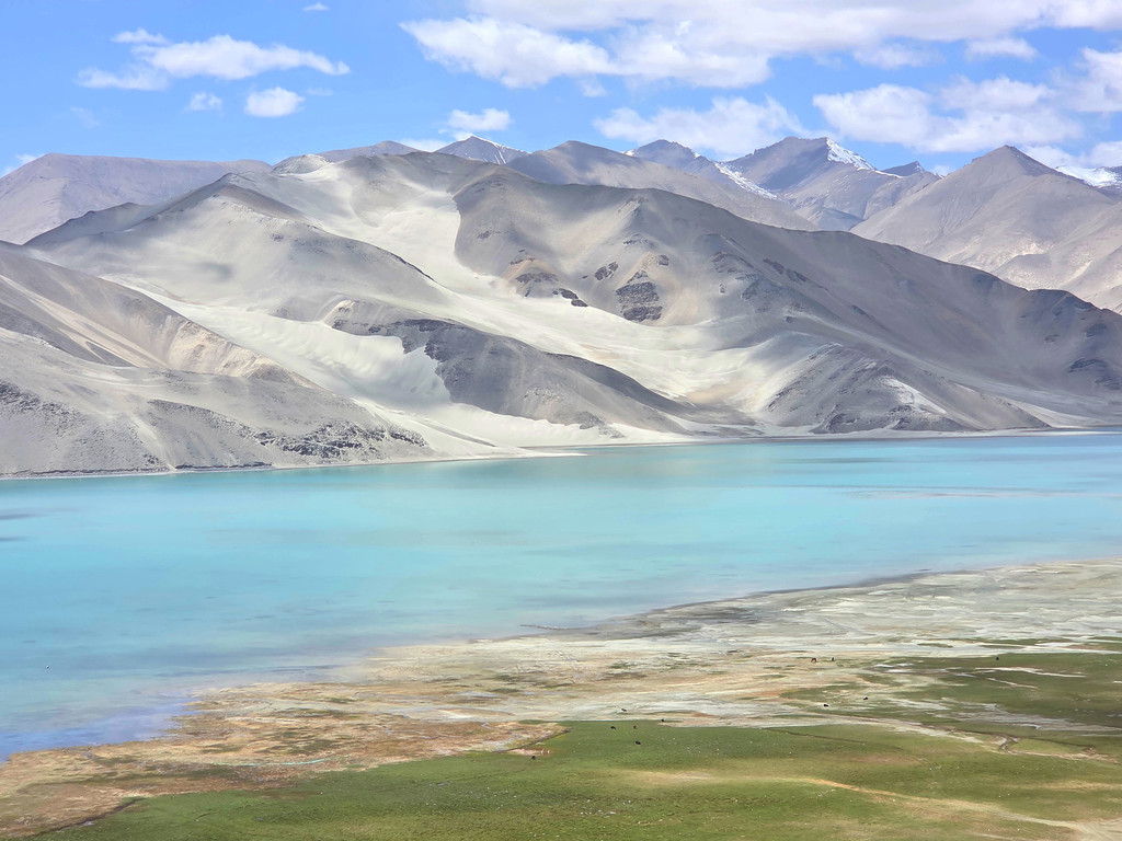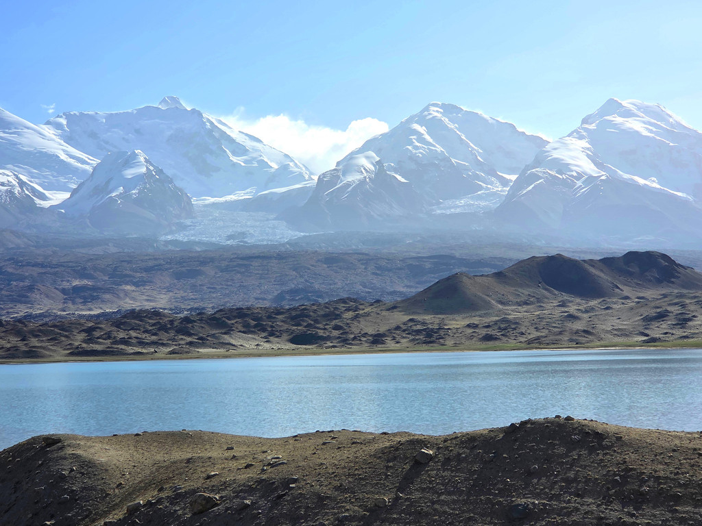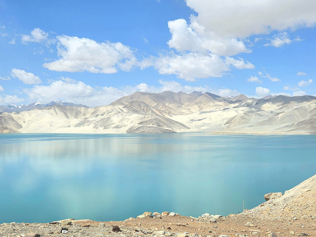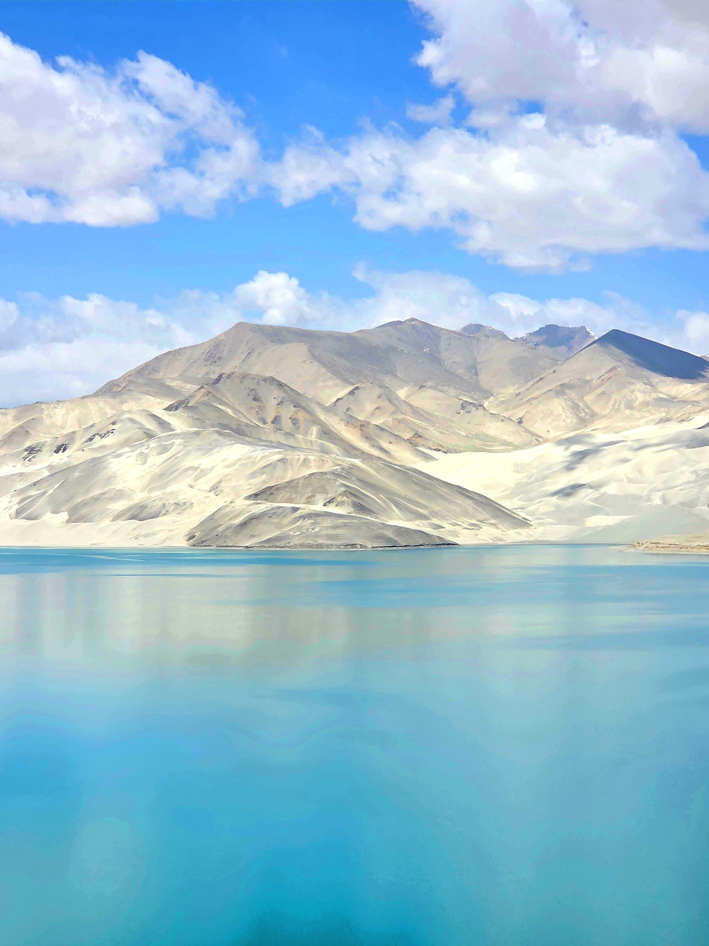 从喀什出发经喀喇昆仑公路(314国道、中巴友谊公路),来到了帕米尔高原。一路上风光无限,在去木吉火山口的路上,会经过白沙湖的北岸,在这里游览观赏白沙山、白沙湖,因其地理位置居高临下,游人又不会很多,景观要比在南岸的景区好。