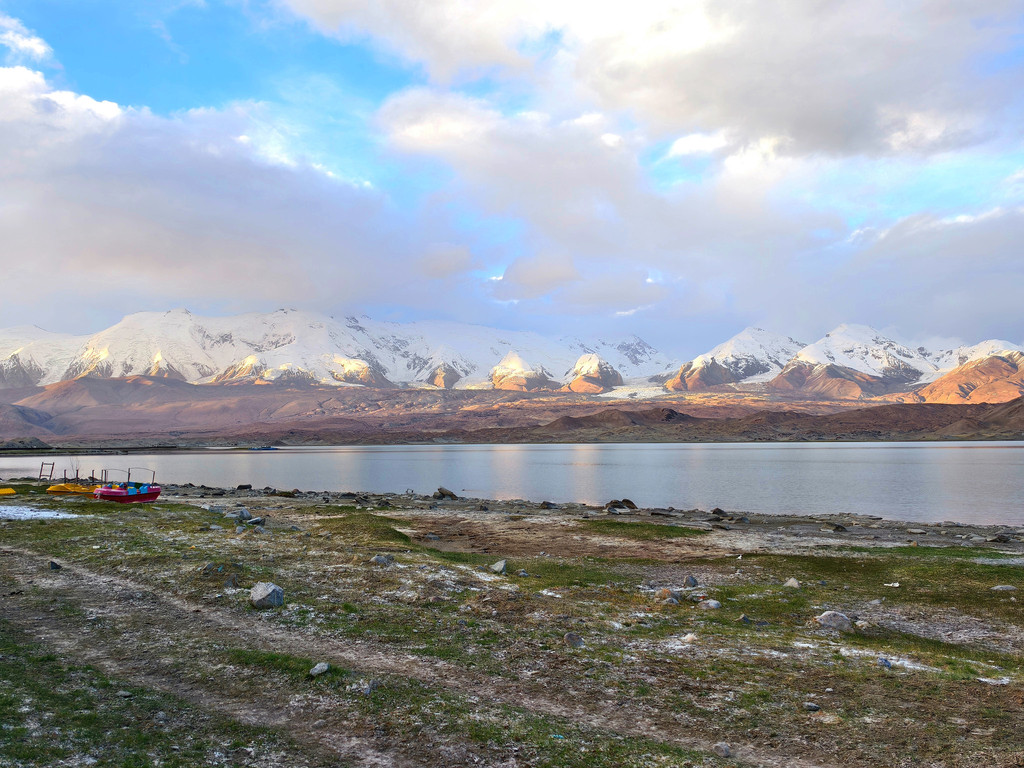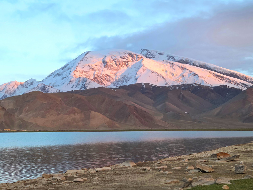 游览完木吉火山口这个帕米尔名副其实的“丹霞地貌博物馆”,往回走120公里,来到今晚的住宿处,位于卡拉库里湖湖边的不周山营地公园。匆忙吃过晚饭,赶紧来到湖边游玩。这时其他游客已基本散去,没有了白天的喧嚣,只有难得的静谧。我们沿着湖边漫步,时不时停下来,静静欣赏着晚霞与号称“雪山之父”慕士塔格峰(海拔7509米)、公格尔峰(海拔7619米)、公格尔九别峰(海拔7530米)这3个终年积雪的雪山与卡拉库里湖相映成趣的湖光山色,享受着四下无人,只有雪山湖水为伴的美好时光,人间值得啊!此情此景,令人陶醉,让人流连忘返,每个瞬间都成将为难忘的记忆。