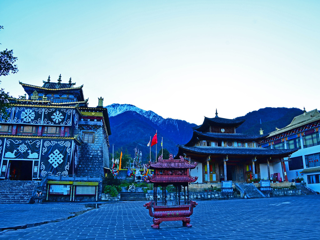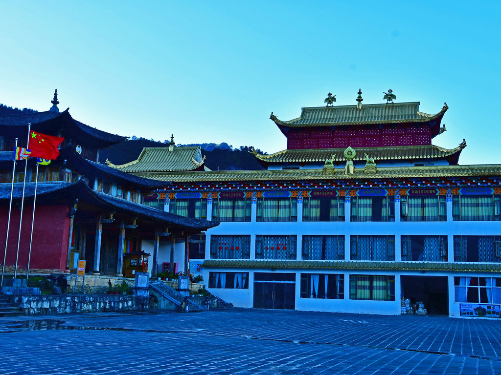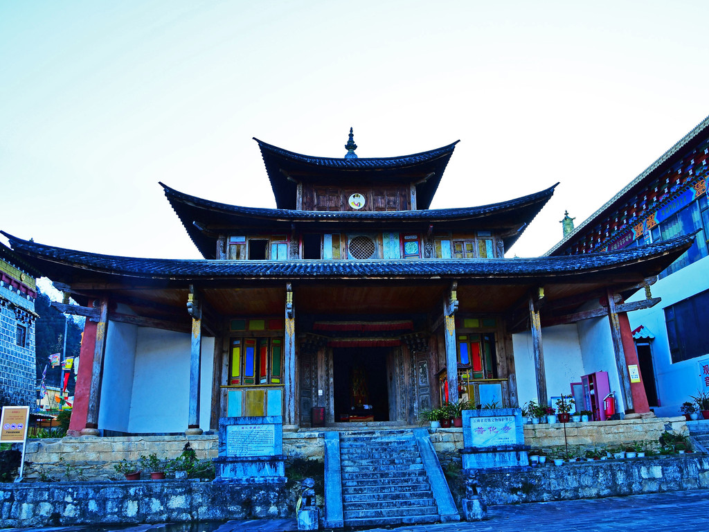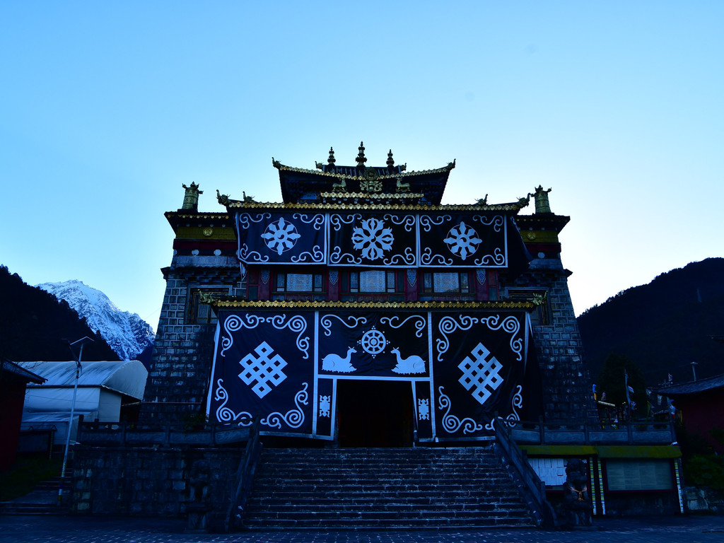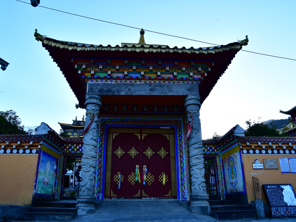 普化寺分为老殿和新殿,老殿较为简陋但显得庄重朴实,新殿则富丽堂皇,装饰金碧辉煌,壁画和唐卡美轮美奂。这里眼望雪山高耸,白云祥霭,山脉俱朝向普化寺环列,如盛开的莲花花瓣,中间的莲花台即是有近三百年历史的普化寺。