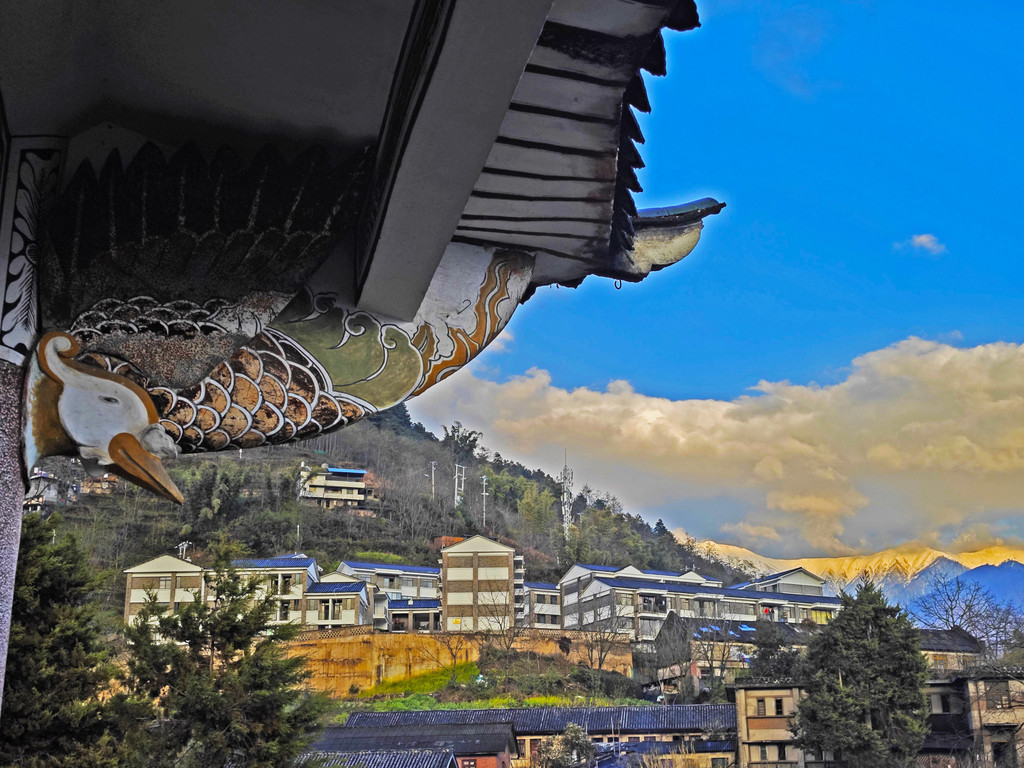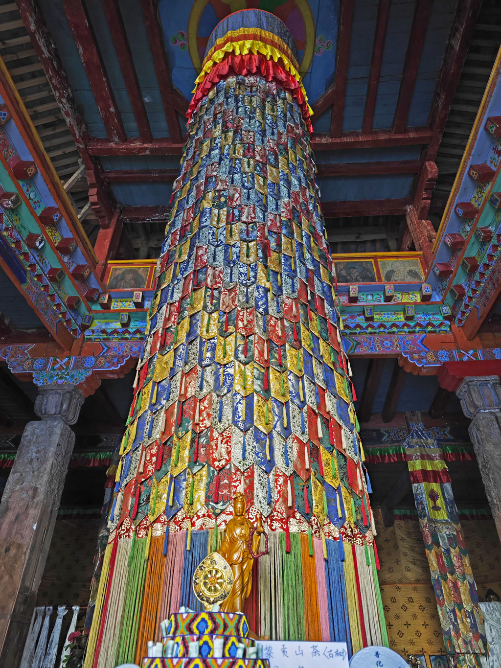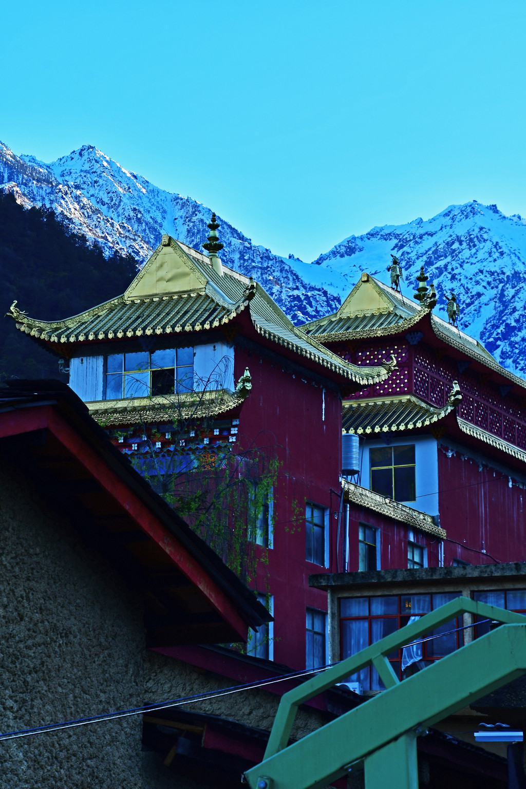 普化寺分为老殿和新殿,老殿较为简陋但显得庄重朴实,新殿则富丽堂皇,装饰金碧辉煌,壁画和唐卡美轮美奂。这里眼望雪山高耸,白云祥霭,山脉俱朝向普化寺环列,如盛开的莲花花瓣,中间的莲花台即是有近三百年历史的普化寺。