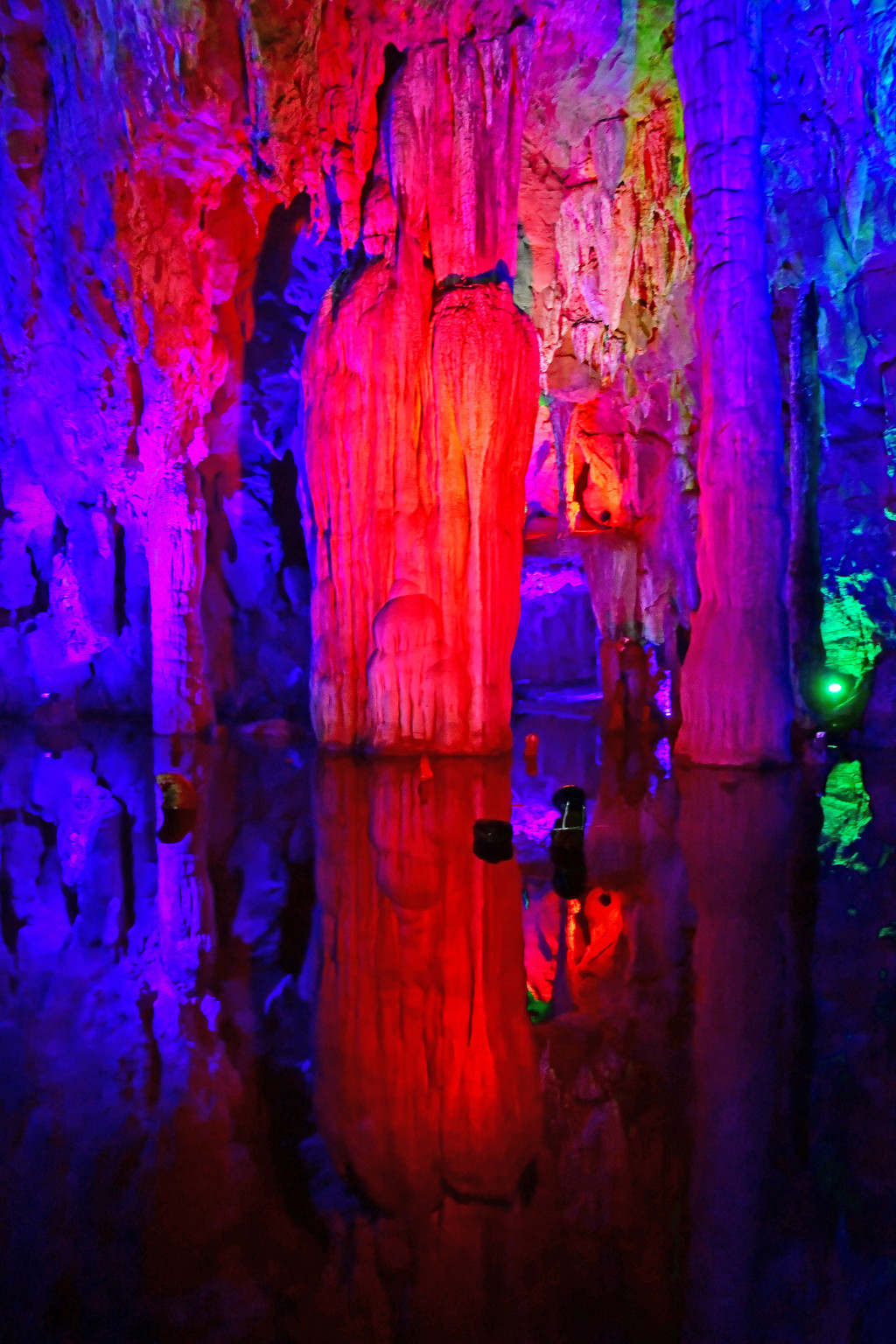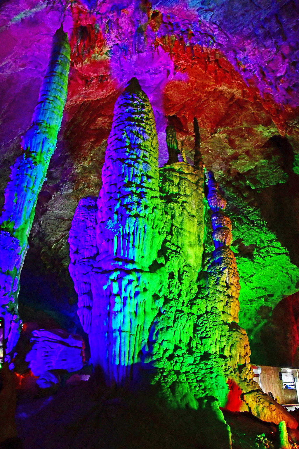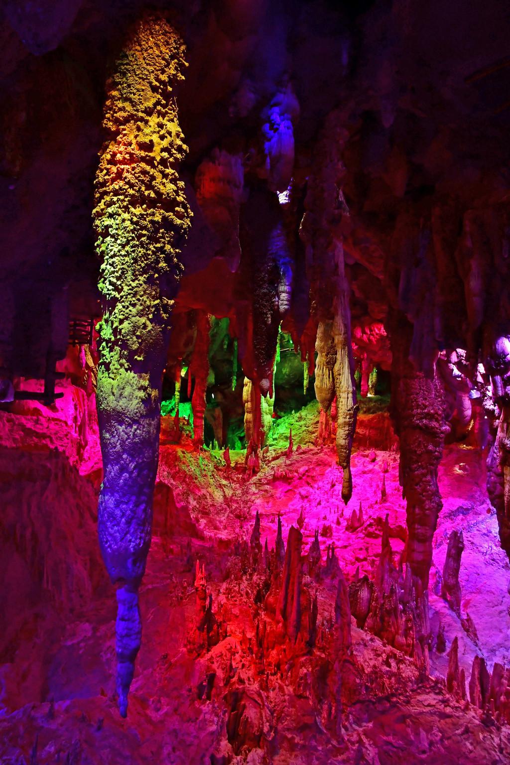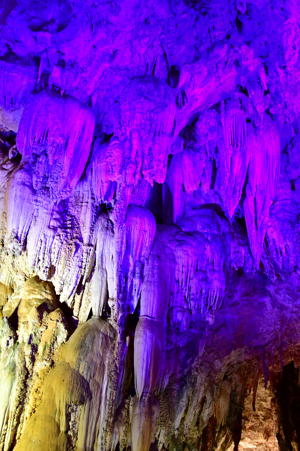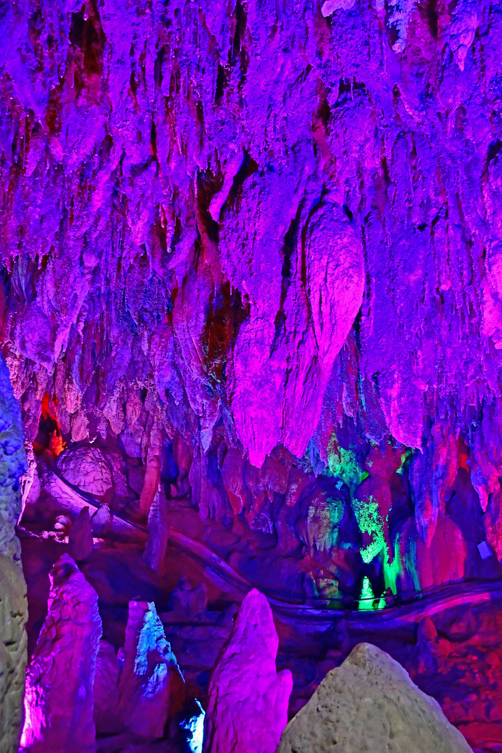 蝙蝠洞的特点是钟乳石倒悬垂挂,如同石林倒长一般,这些钟乳石还有一个与众不同的特点,就是石林倾斜幅度大,不规则,细究起来,是因为空气流向不同而造成的,于是在九乡又添了一个风吹石弯的神奇景致。