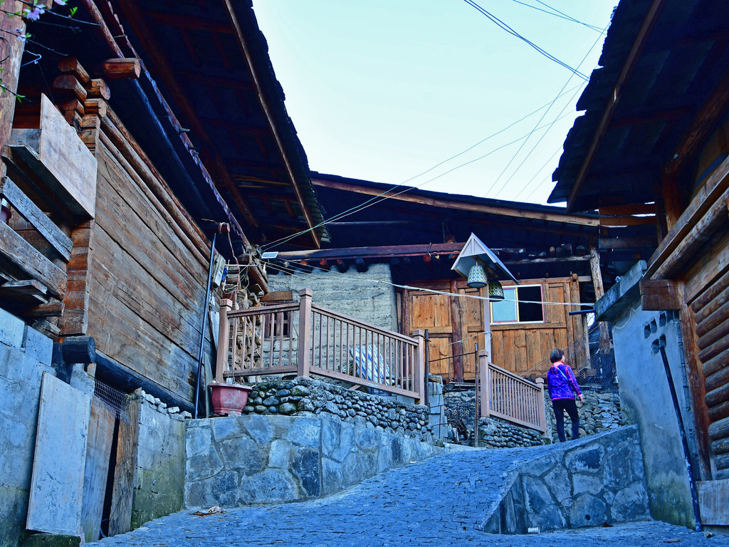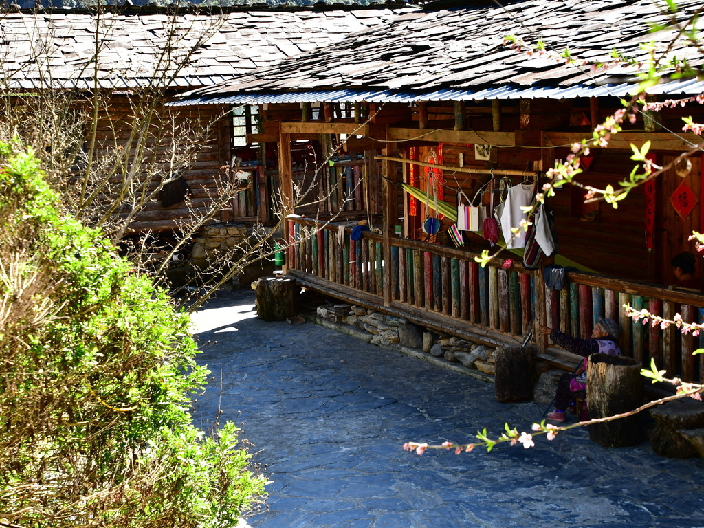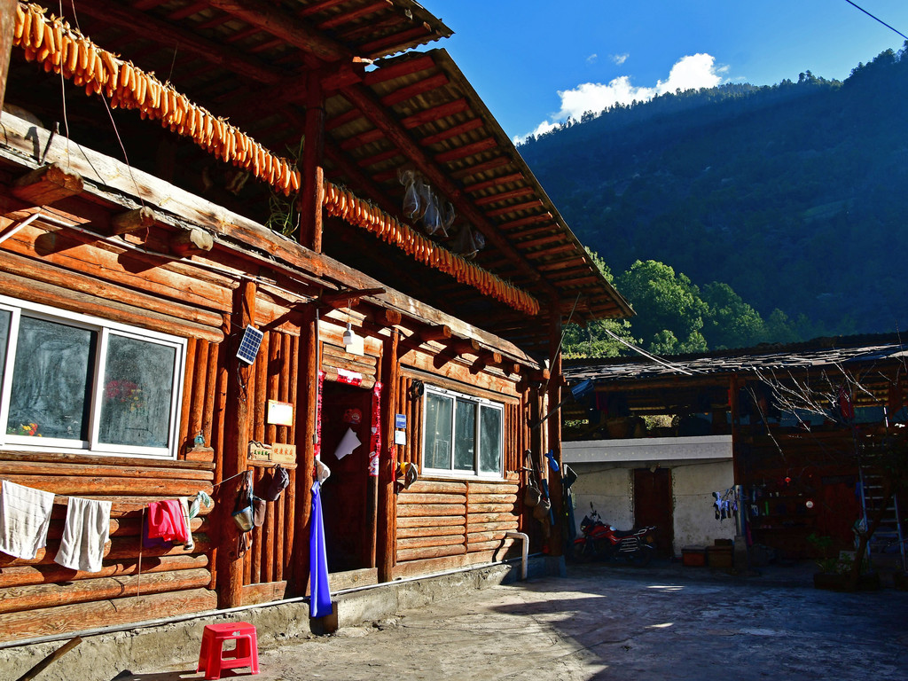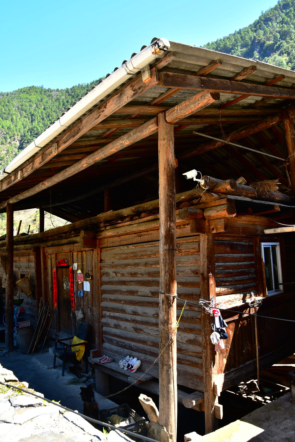 当地的房屋是典型的怒族格调,就地取材,全木头房子,房顶不是瓦片,而是用石板盖起来的。房子一般分两层,下层喂养牲畜,上层住人。