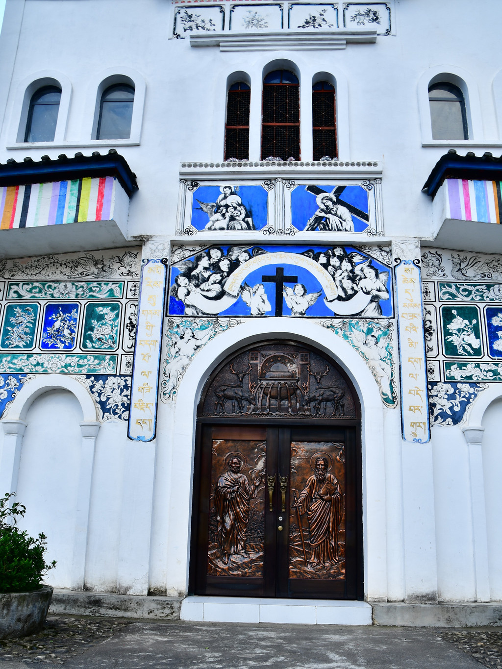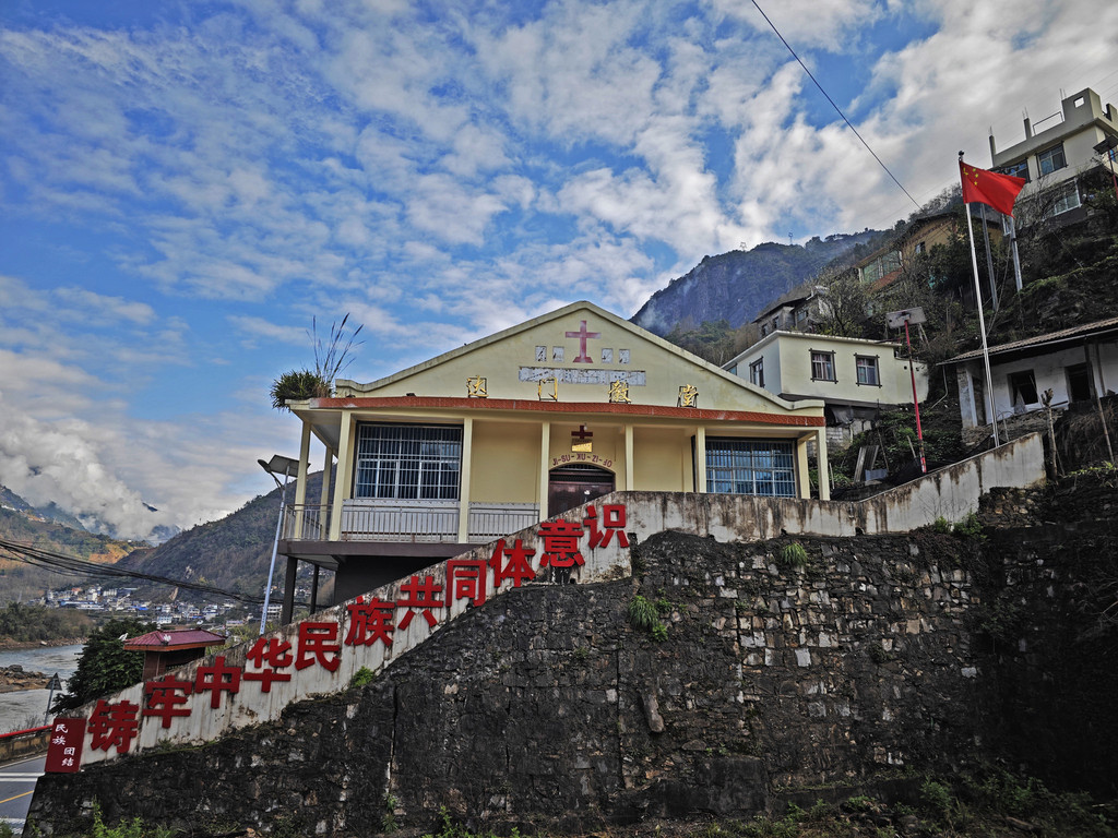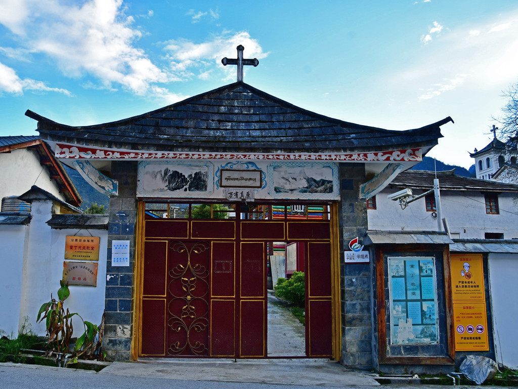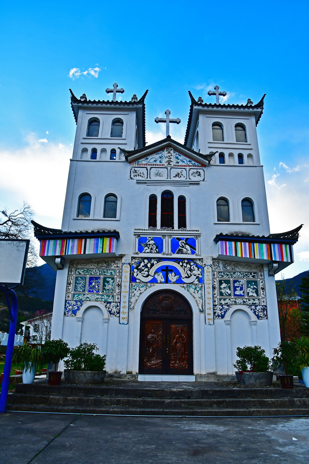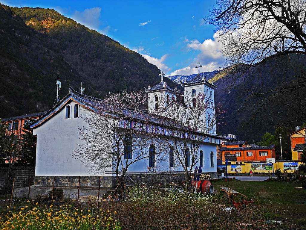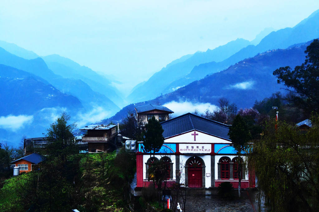 达门教堂位于怒江大峡谷的219公路旁。这座教堂由法国传教士修建,是怒江流域最大的基督教堂之一。教堂的建筑风格独特,具有哥特式特征,尽管在文化大革命时期遭受破坏,但1996年重建后仍保留了原有的白色双塔设计。教堂坐落在悬崖边,青砖墙、红漆木窗、白铁皮屋顶,与周围的自然环境和谐共存,显得格外朴素而美丽。