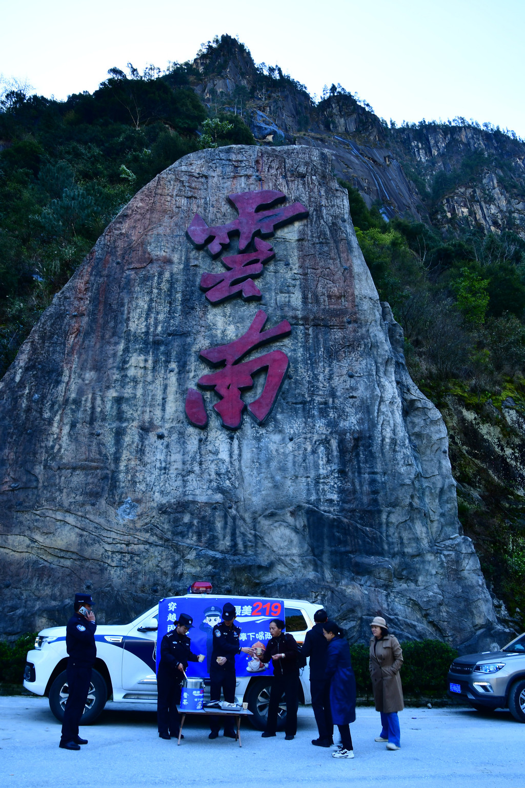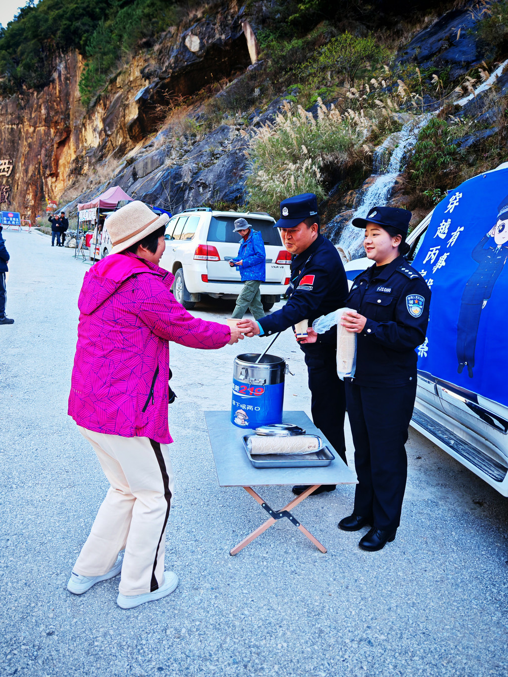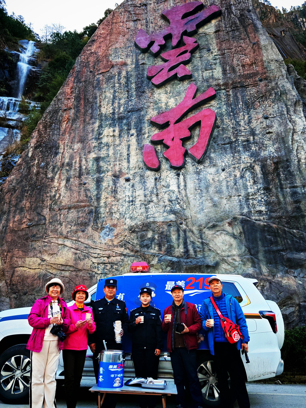 25分钟后,我们驱车来到滇藏界,滇藏界是云南和西藏的交界处,也是“丙察察”线的起点。这块蓝色的铁牌上写着“滇藏界”和“西藏界”,标志着从这里开始就进入了西藏的地界。这里曾是茶马古道滇藏马帮的必经点,沿途的自然景观和人文风情极为丰富。界碑的存在不仅是一个地理标志,更是文化与历史的见证,吸引着众多旅行者前来朝圣和探索。由于进入西藏的道路经常有碎石或山体滑坡是现象,因此当地政府规定:星期一至星期五禁止一切车辆通行,周六日可经过这里入藏。我们只是来打卡而已,来到滇藏界,马上受到了民警的热情接待,民警们热情地递来了热气腾腾的姜茶,即使当时的气温只有10°左右,我们的心暖暖的,我们被民警温柔以待,真是太幸福了。通过了解,原来是丙中洛边境派出所通过“普法茶水铺”和“景警随行”党员先锋服务队活动,营造了和谐安全的旅游环境。