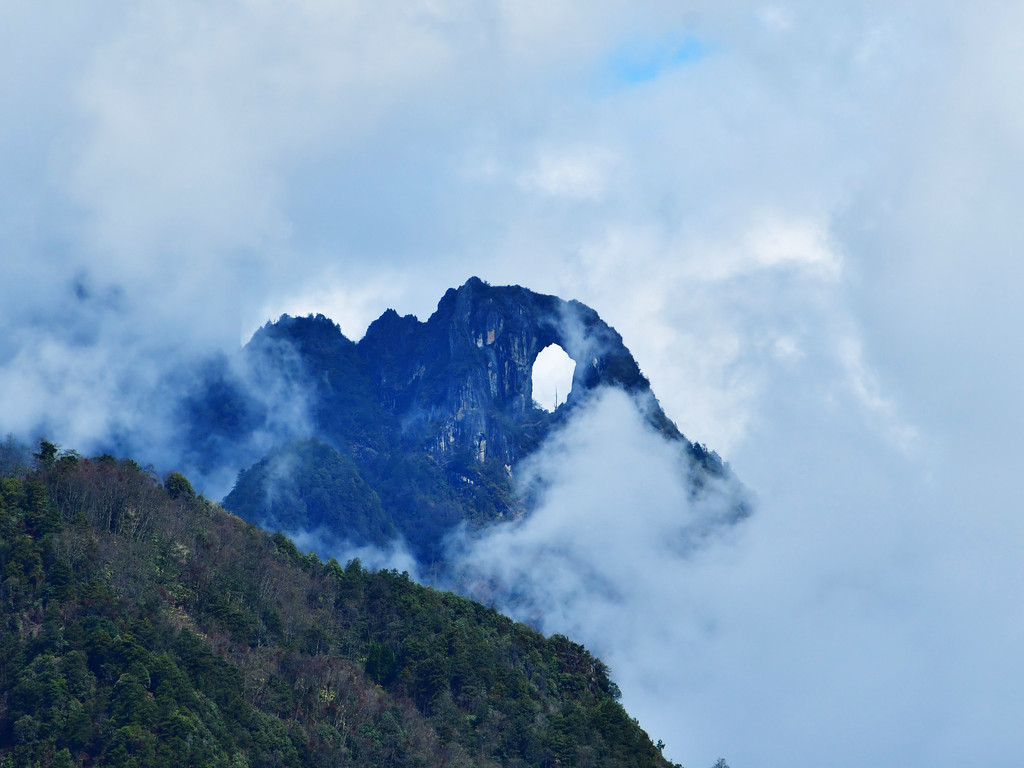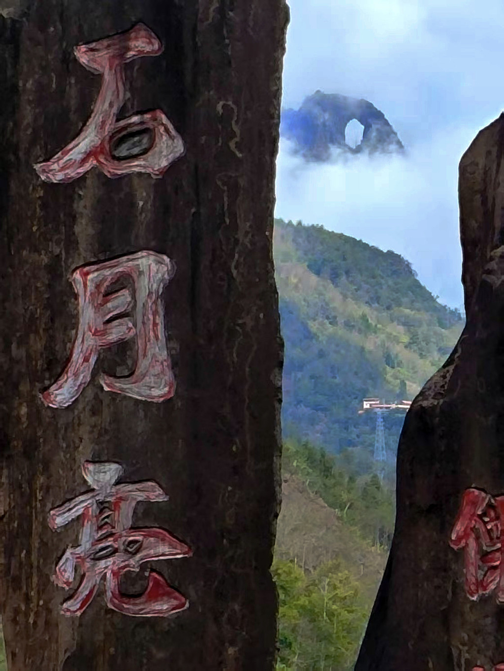 石月亮位于怒江福贡县的高黎贡山山脉中段,海拔3300米的高峰上。它是一个巨大的大理岩溶蚀形成的穿洞,洞深约百米,宽约40米,高约60米。从远处眺望,透过石洞可以看到一轮明月悬挂在山海峰林之间,景象壮观。