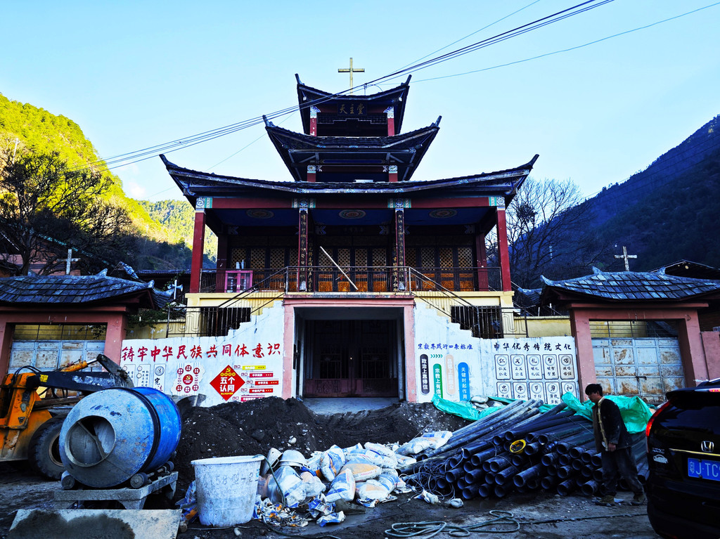 重丁天主教堂位于云南省贡山县丙中洛镇重丁村,是整个贡山县最辉煌、最壮观的建筑物之一,被誉为“迷你版的巴黎圣母院”。重丁天主教堂始建于1908年,由法国天主教传教士任安守主持建造。教堂采用法国式结构,两侧为住楼,中间为礼拜堂,并建有两座钟楼。工程历时10年,于1918年竣工并投入使用。在文革期间,教堂被毁,但在1996年原址重建,规模远小于过去的大教堂。