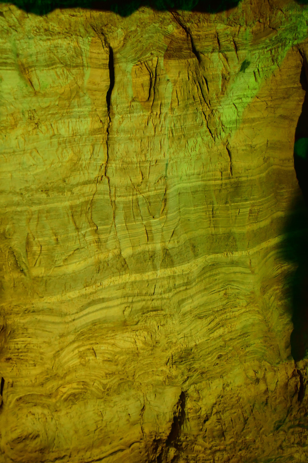 “鳄鱼”石板:地壳隆升前后,地下水冲刷磨蚀洞壁成凹穴状,加上岩石成层性好,凹穴上部的岩层受重力掉落,至今仅剩下这薄薄的一块岩板,酷似鳄鱼下颚,岩板上的那颗较大的石笋酷似鳄鱼的牙齿,形象逼真。