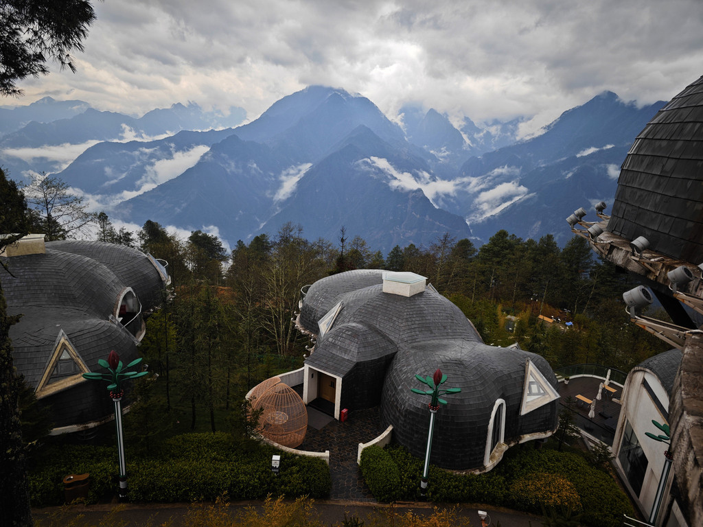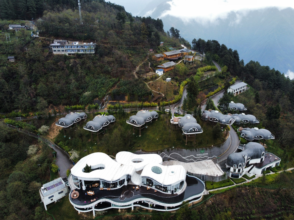 知子罗云上宫房酒店:到达知子罗村沿着山路继续上行,很快就到达该酒店了,酒店建筑风格参考了怒族的传统民居,结合了树屋和穴居的形式,巧妙地利用了陡峭的山地,隐匿在山林之间。每个房间都是最好的观景台,可以欣赏到雪山、皇冠山、云海和蜿蜒的怒江等美景。