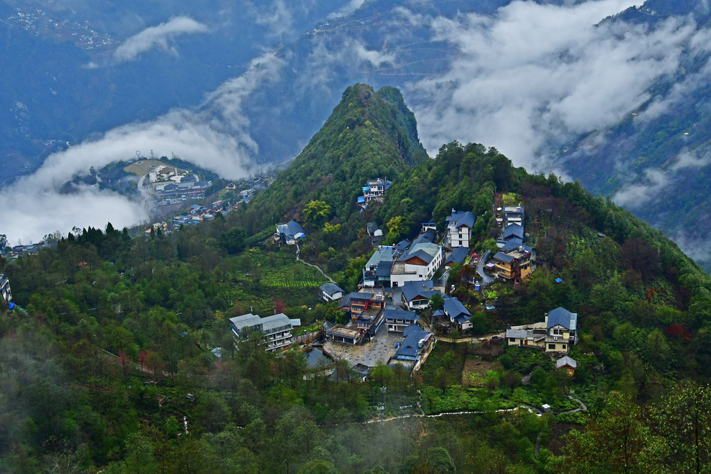 老姆登村:位于怒江大峡谷中段,隶属福贡县匹河怒族乡,东邻兰坪,南接知子罗,西靠棉谷,北连沙瓦,海拔1800-1850米,年平均气温13.8℃,年降水量1163毫米。老姆登村背靠碧罗雪山,面朝高黎贡山皇冠峰,是观赏峡谷地貌的绝佳位置。“老姆登”是怒族语的音译,意思是“人喜欢来的地方”。整个村庄被高山环抱,远眺可见碧罗雪山和高黎贡山,山脚下是壮丽的怒江峡谷。这里常年云雾缭绕、梯田沿着陡峭山势盘旋而上,木楞房错落分布于原始森林边缘。是一个“云端村落”的傈僳族古寨。因该地土壤、气温、降水、光照等因素的得天独厚,以该村名命名的“老姆登茶”享誉全州内外。